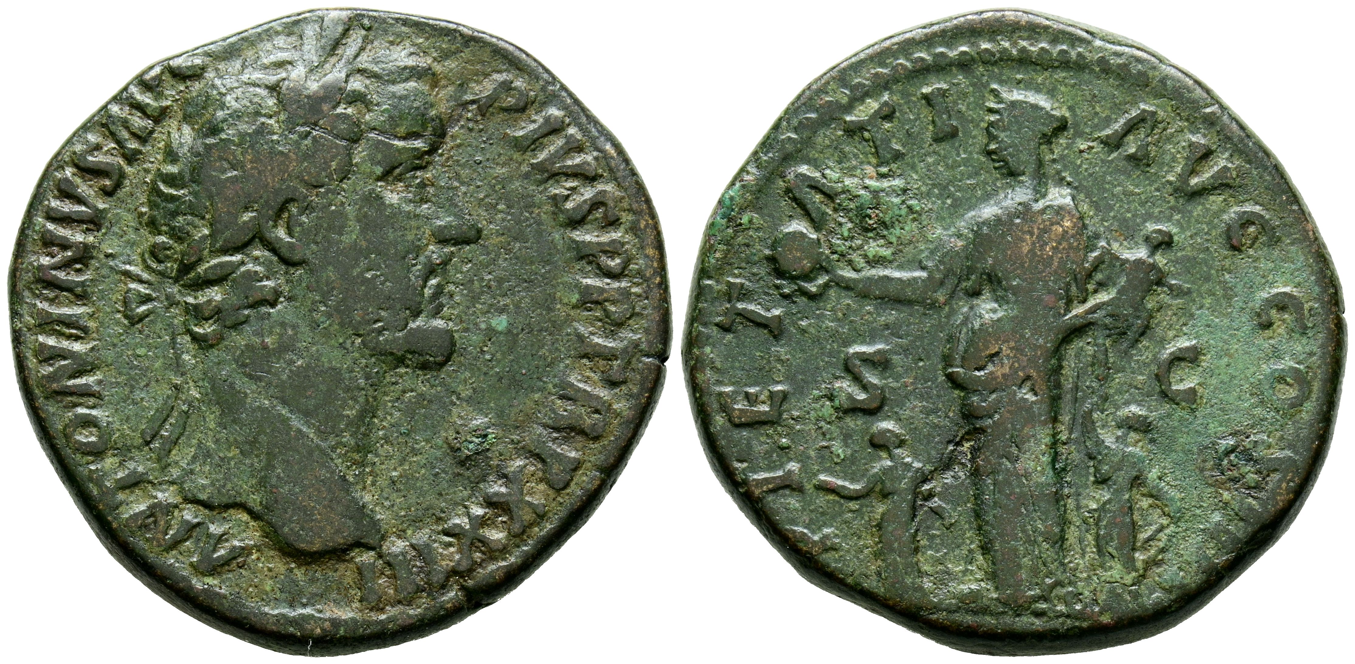 ANTONINO PIO. Sestercio. (Ae. 22,25g/30mm). 159-160 d.C. Roma. (RIC 1031). Anv: Cabeza laureada de Antonino Pío a derecha, alrededor leyenda: ANTONINVS AVG PIVS P P TR P XXIII. Rev: Pietas estante con niño en sus brazos y globo en su mano derecha, a sus pies dos niños, entre: S-C, alrededor leyenda: PIETATI AVG COS IIII. MBC-.