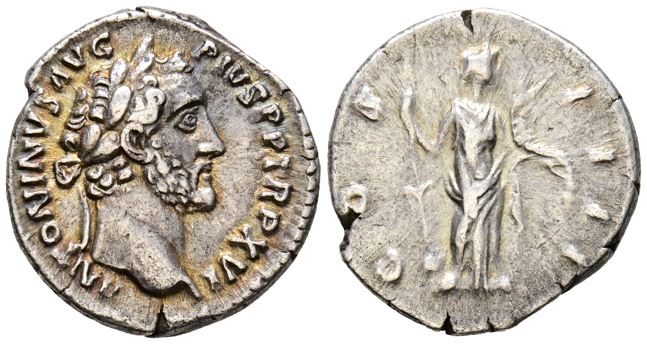 ANTONINO PIO. Denario. (Ar. 3,20g/18mm). 152-153 d.C. Roma. (RIC 222). Anv: Cabeza laureada de Antonino Pío a derecha, alrededor leyenda: ANTONINVS AVG PIVS P P TR P XVI. Rev: Fortuna estante a derecha portando cornucopia y timón, alrededor leyenda: COS IIII. MBC+/MBC.