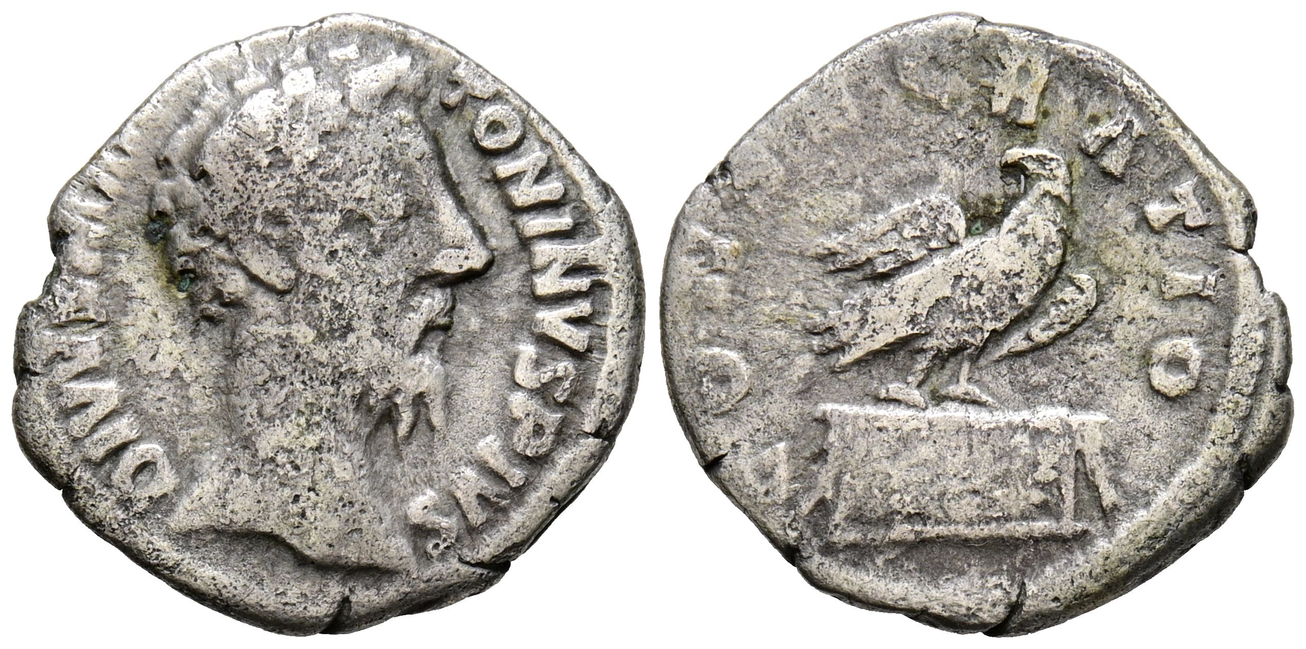 DIVO MARCO AURELIO. Denario. (Ar. 2,61g(17mm). 180 d.C. Roma. (RIC 272). Anv: Cabeza de Marco Aurelio a derecha, alrededor leyenda: DIVVS M ANTONINVS PIVS. Rev: Aguila estante a derecha mirando a izquierda sobre altar, alrededor leyenda: CONSECRATIO. BC+.