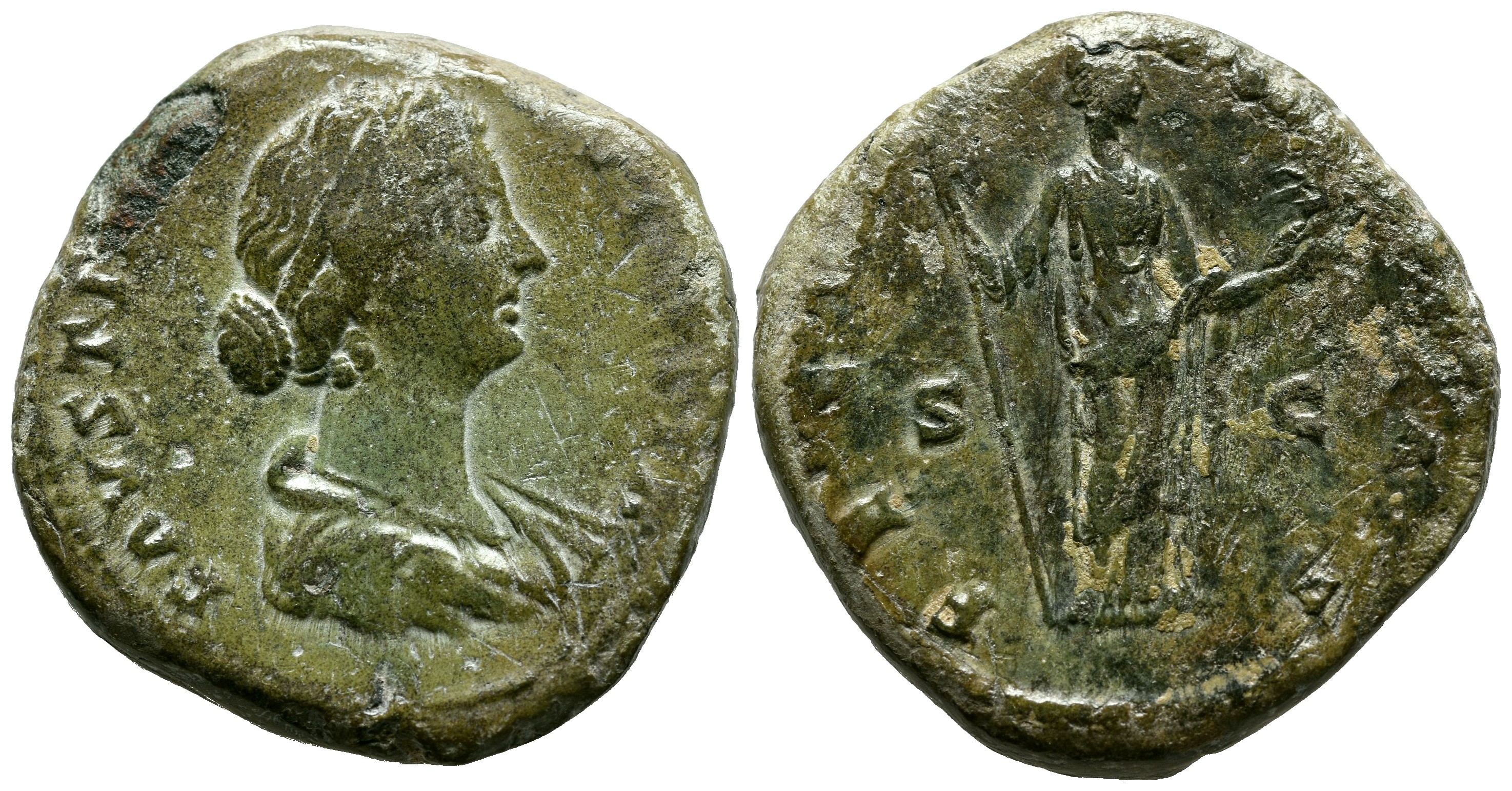 FAUSTINA II. Sestercio. (Ae. 18,85g/32mm). 161-176 d.C. Roma. (RIC 1638). Anv: Busto diademado y drapeado de Faustina II a derecha, alrededor leyenda: FAVSTINA AVGVSTA. Rev: Fecunditas estante a izquierda portando cetro y Victoria con corona de laurel, entre: S-C, alrededor leyenda: FACVNDITAS. MBC+. Bonita pátina.