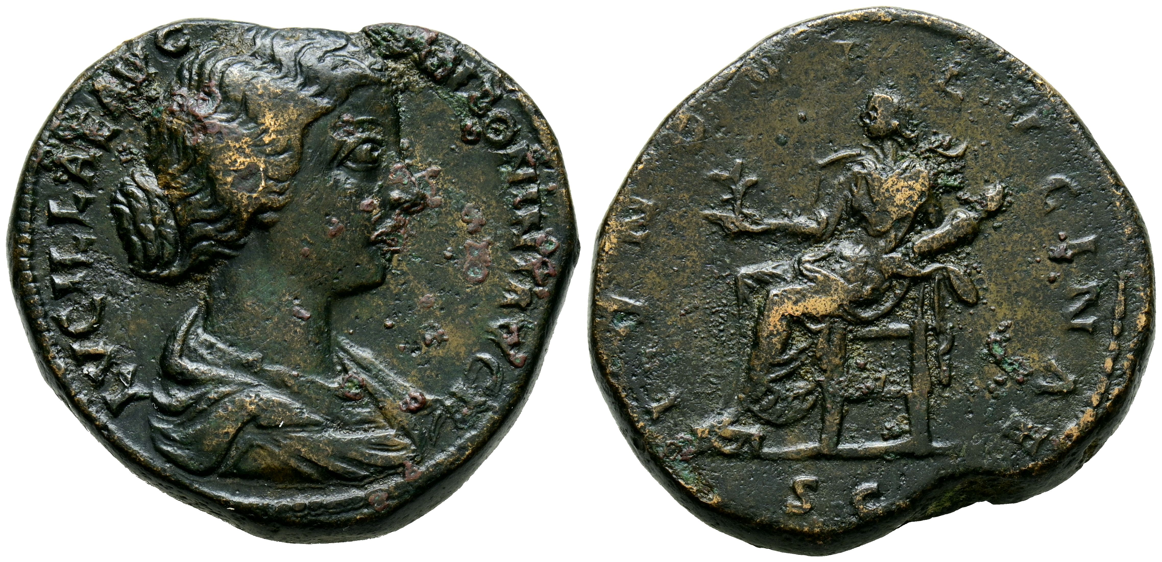 LUCILLA. Sestercio. (Ae. 26,09g/31mm). 164-168 d.C. Roma. (RIC 1747). Anv: Busto drapeado de Lucilla a derecha, alrededor leyenda: LVCILLAE AVG ANTONINI AVG F. Rev: Juno sentada a izquierda portando cornucopia y flor, en exergo: SC, alrededor leyenda: IVNONI LCVINAE. MBC.