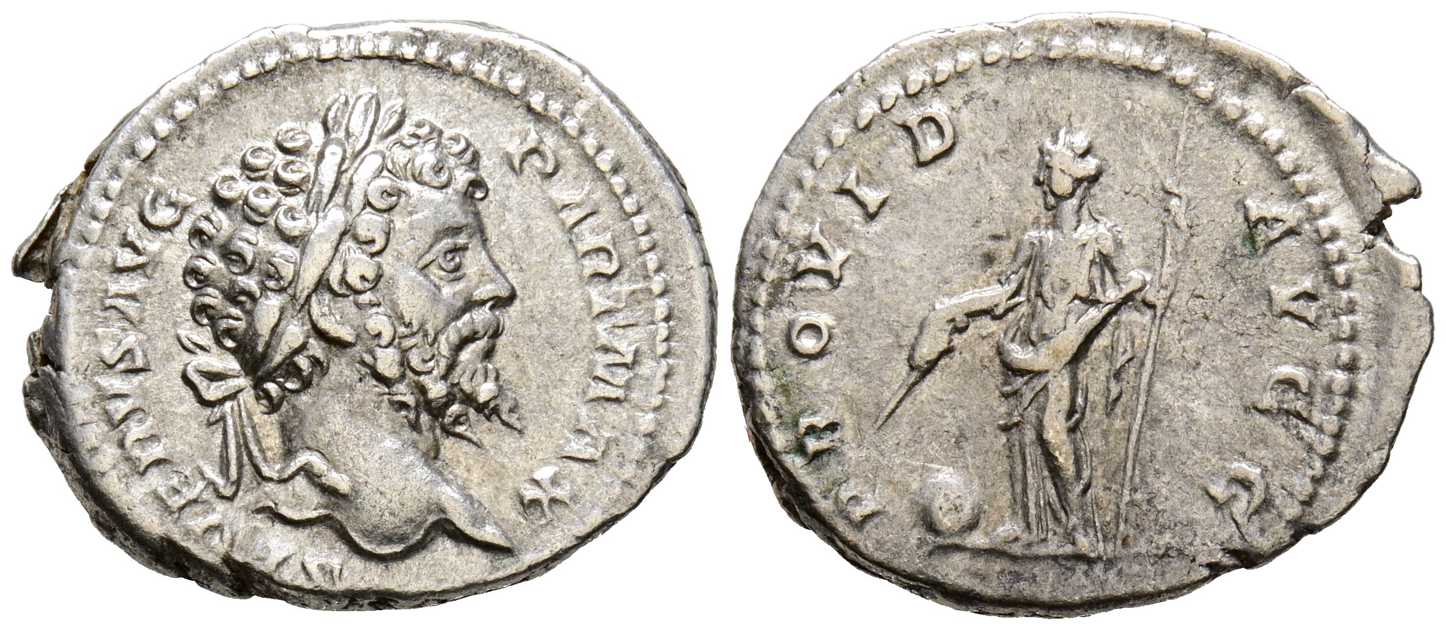 SEPTIMIO SEVERO. Denario. (Ar. 3,49g/20mm). 200-201 d.C. Roma. (RIC 166). Anv: Busto laureado de Septimio Severo a derecha, alrededor leyenda: SEVERVS AVG PART MAX. Rev: Providentia estante a izquierda con vara sobre globo y cetro, alrededor leyenda: PROVID AVGG. MBC+/MBC.