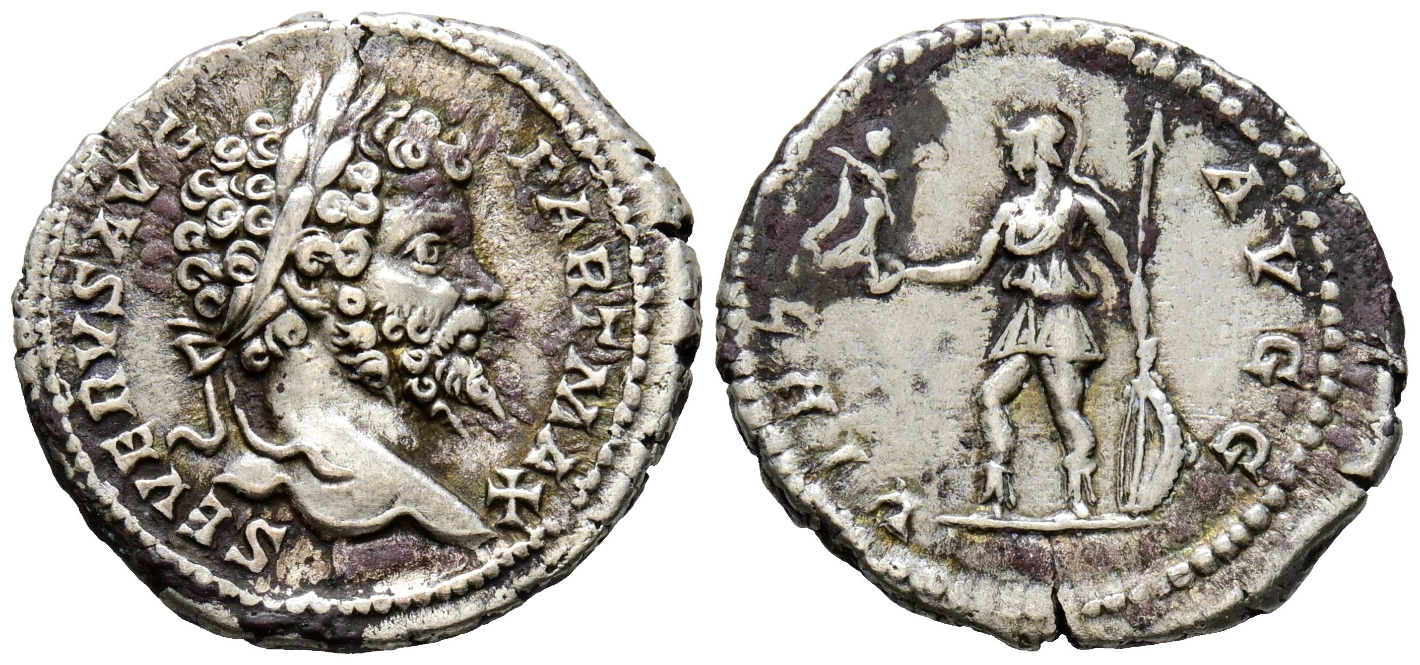 SEPTIMIO SEVERO. Denario. (Ar. 3,29g/20mm). 200-201 d.C. Roma. (RIC 171a). Anv: Busto laureado de Septimio Severo a derecha, alrededor leyenda: SEVERVS AVG PART MAX. Rev: Virtus estante a izquierda portando Victoria y lanza, detrás escudo, alrededor leyenda: VIRT AVGG. MBC-.