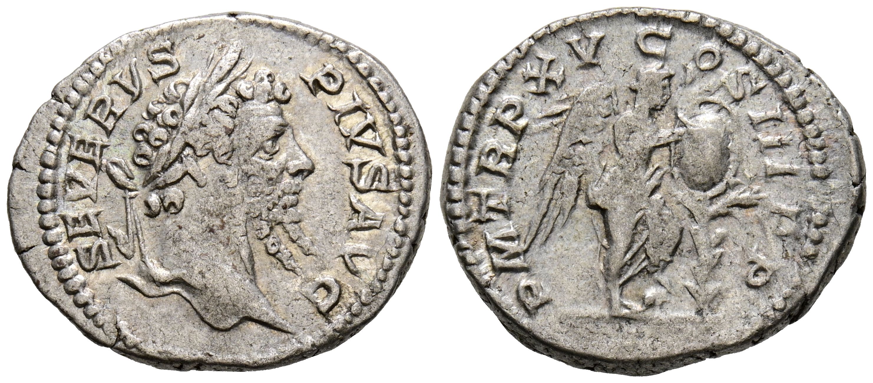 SEPTIMIO SEVERO. Denario. (Ar. 4,22g/21mm). 207 d.C. Roma. (RIC 211). Anv: Busto laureado de Septimio Severo a derecha, alrededor leyenda: SEVERVS PIVS AVG. Rev: Victoria estante a derecha con pie sobre globo, inscribiendo en un escudo sobre una palmera, alrededor leyenda: P M TR P XV COS III P P. MBC.