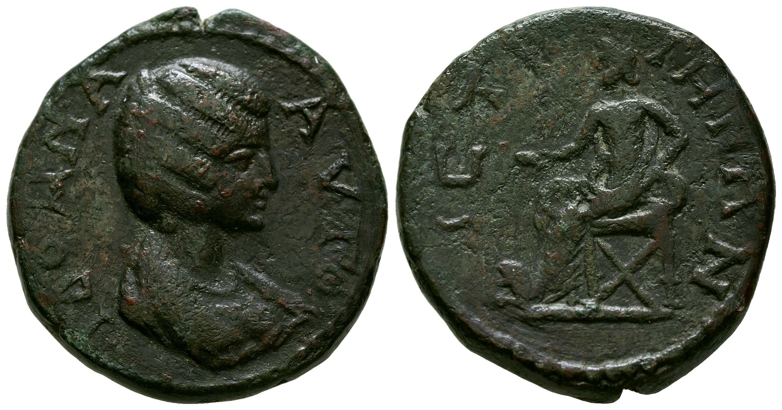 JULIA DOMNA. Ae27. (Ae. 19,96g/27mm). 193-217 d.C. Istros. (Varbanov 626). Anv: Busto drapeado de Julia Domna a derecha, alrededor leyenda griega. Rev: Cibeles sentada a izquierda portando patera y apoyando codo sobre tambor, alrededor leyenda griega. MBC-.