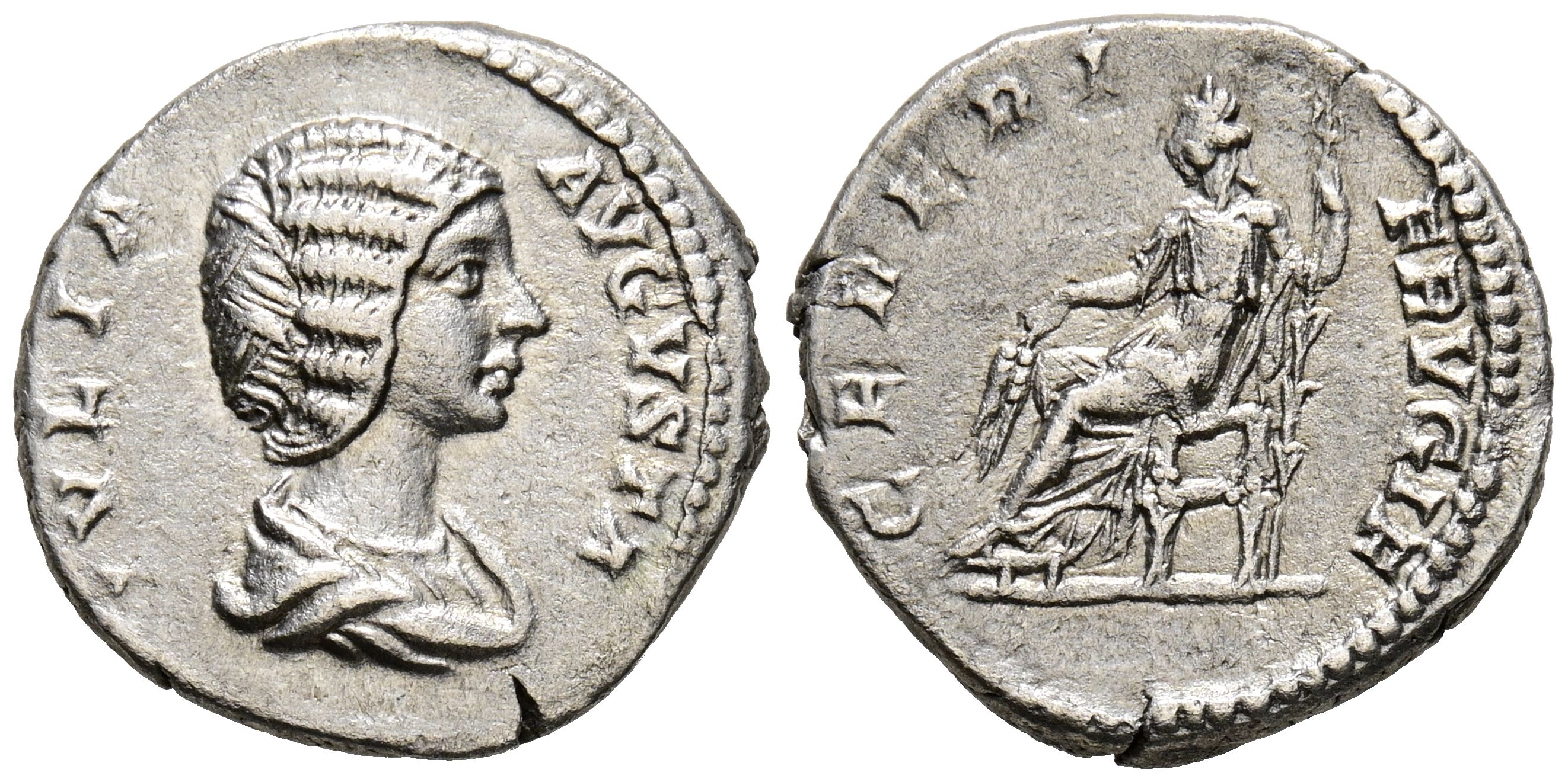 JULIA DOMNA. Denario. (Ar. 2,79g/18mm). 196-211 d.C. Roma. (RIC 546). Anv: Busto drapado de Julia Domna a derecha, alrededor leyenda: IVLIA AVGVSTA. Rev: Ceres sentada a izquierda portando espigas y cetro, alrededor leyenda: CERERI FRVGIF. MBC.