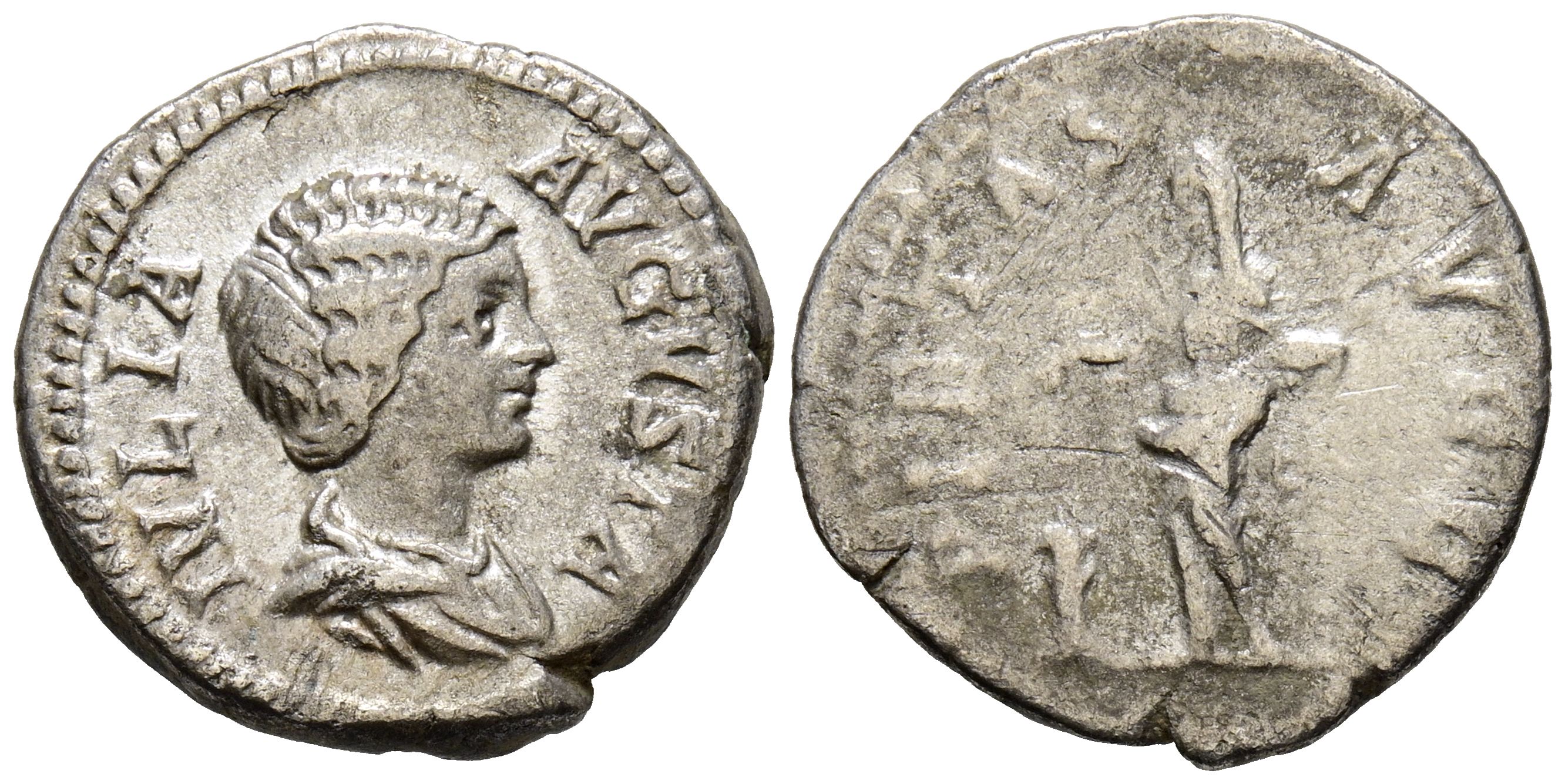 JULIA DOMNA. Denario. (Ar. 2,63g/18mm). 196-211 d.C. Roma. (RIC 572). Anv: Busto drapeado de Julia Domna a derecha, alrededor leyenda: IVLIA AVGVSTA. Rev: Pietas estante a izquierda con patera sobre altar, alrededor leyenda: PIETAS AVGG. MBC/MBC-.