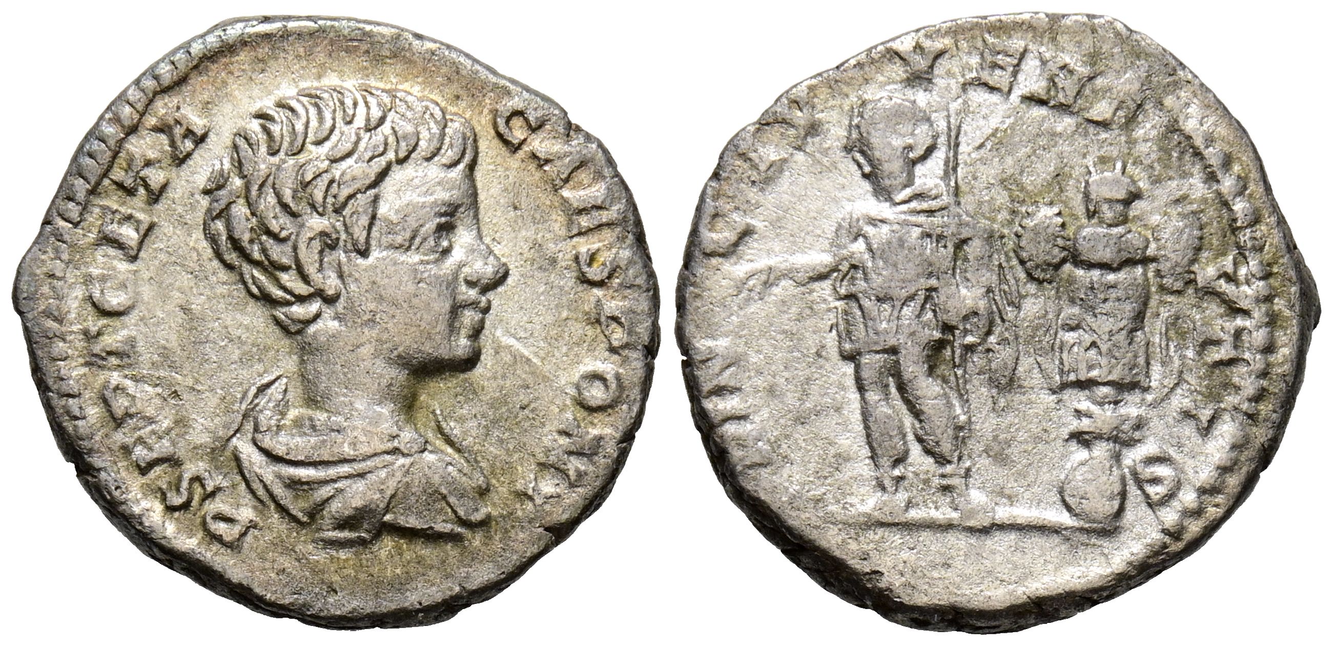 GETA. Denario. (Ar. 2,50g/18mm). 200-202 d.C. Roma. (RIC 18). Anv: Busto drapeado de Geta a derecha, alrededor leyenda: P SEPT GETA CAES PONT. Rev: Geta estante a izquierda portando cetro y vara, detrás trofeo de armas, alrededor leyenda: PRINC IVVENTVTIS. MBC-.