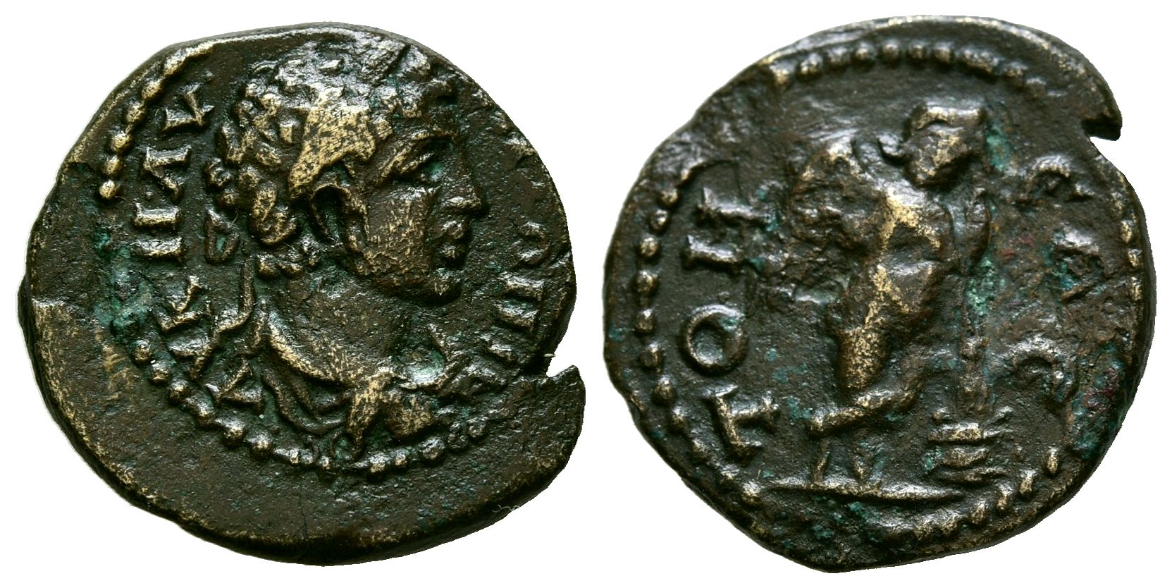 CARACALLA. Ae17. (Ae. 2,58g/17mm). 197-217 d.C. Tomis. (Varbanov 5016). Anv: Busto laureado y drapeado de Caracalla a derecha, alrededor leyenda griega. Rev: Eros Thanatos estante a derecha apoyado en antorcha sobre altar, alrededor leyenda griega. MBC+/MBC.