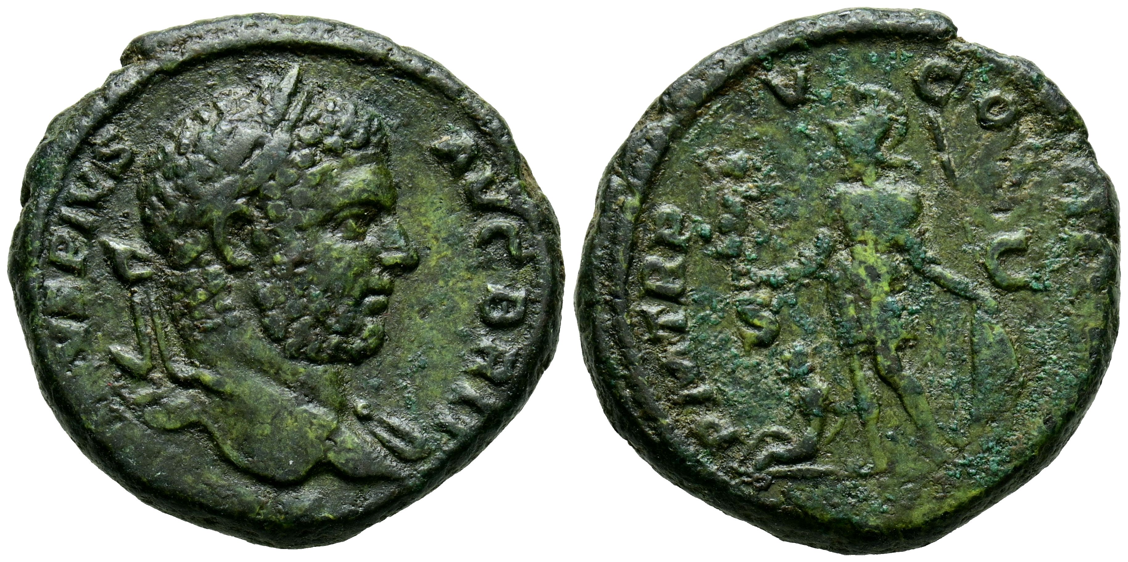 CARACALLA. As. (Ae. 12,36g/26mm). 212 d.C. Roma. (RIC 493a). Anv: Cabeza laureada de Caracalla a derecha, alrededor leyenda: ANTONINVS PIVS AVG BRIT. Rev: Marte estante a izquierda portando lanza y Victoria con corona de laurel, detrás escudo, a sus pies cautivo, entre: S-C, alrededor leyenda: P M TR P V COS III P P. MBC-.