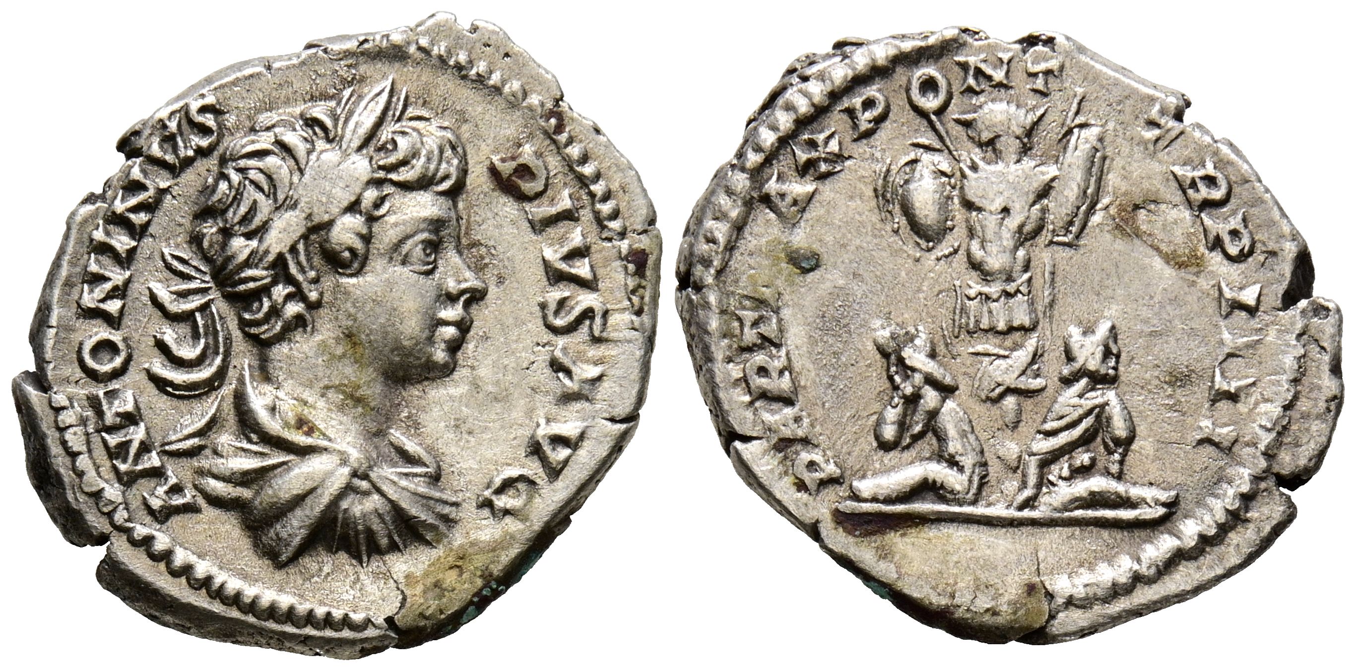 CARACALLA. Denario. (Ar. 3,32g/20mm). 201 d.C. Roma. (RIC 54b). Anv: Busto laureado, drapeado y con coraza de Caracalla a derecha, alrededor leyenda: ANTONINVS PIVS AVG. Rev: Trofeo entre dos cautivos sentados, alrededor leyenda: PART MAX PONT TR P IIII. MBC+.