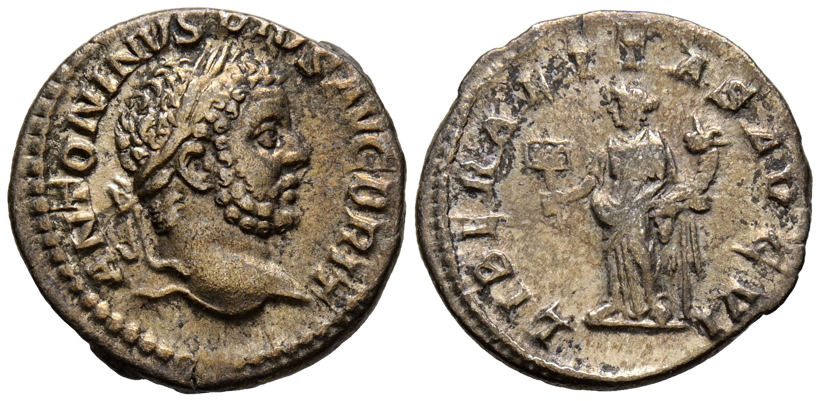 CARACALLA. Denario. (Ar. 2,83g/18mm). 210-213 d.C. Roma. (RIC 216). Anv: Cabeza laureada de Caracalla a derecha, alrededor leyenda: ANTONINVS PIVS AVG BRIT. Rev: Liberalitas estante a izquierda portando ábaco y cornucopia, alrededor leyenda: LIBERALITAS AVG VI. MBC+.