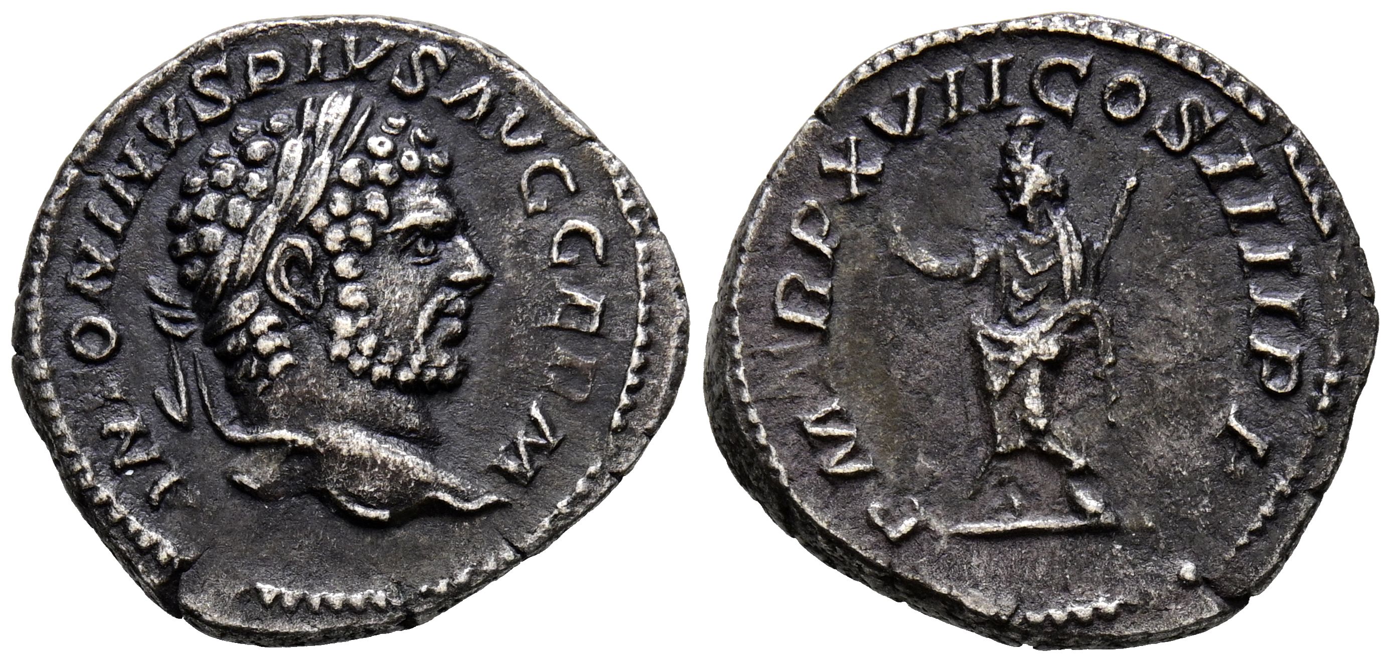 CARACALLA. Denario. (Ar. 3,27g/18mm). 214 d.C. Roma. (RIC 244). Anv: Cabeza laureada de Caracalla a derecha, alrededor leyenda: ANTONINVS PIVS AVG GERM. Rev: Serapis estante a izquierda portando cetro y alzando mano derecha, alrededor leyenda: P M TR P XVII COS IIII P P. MBC.
