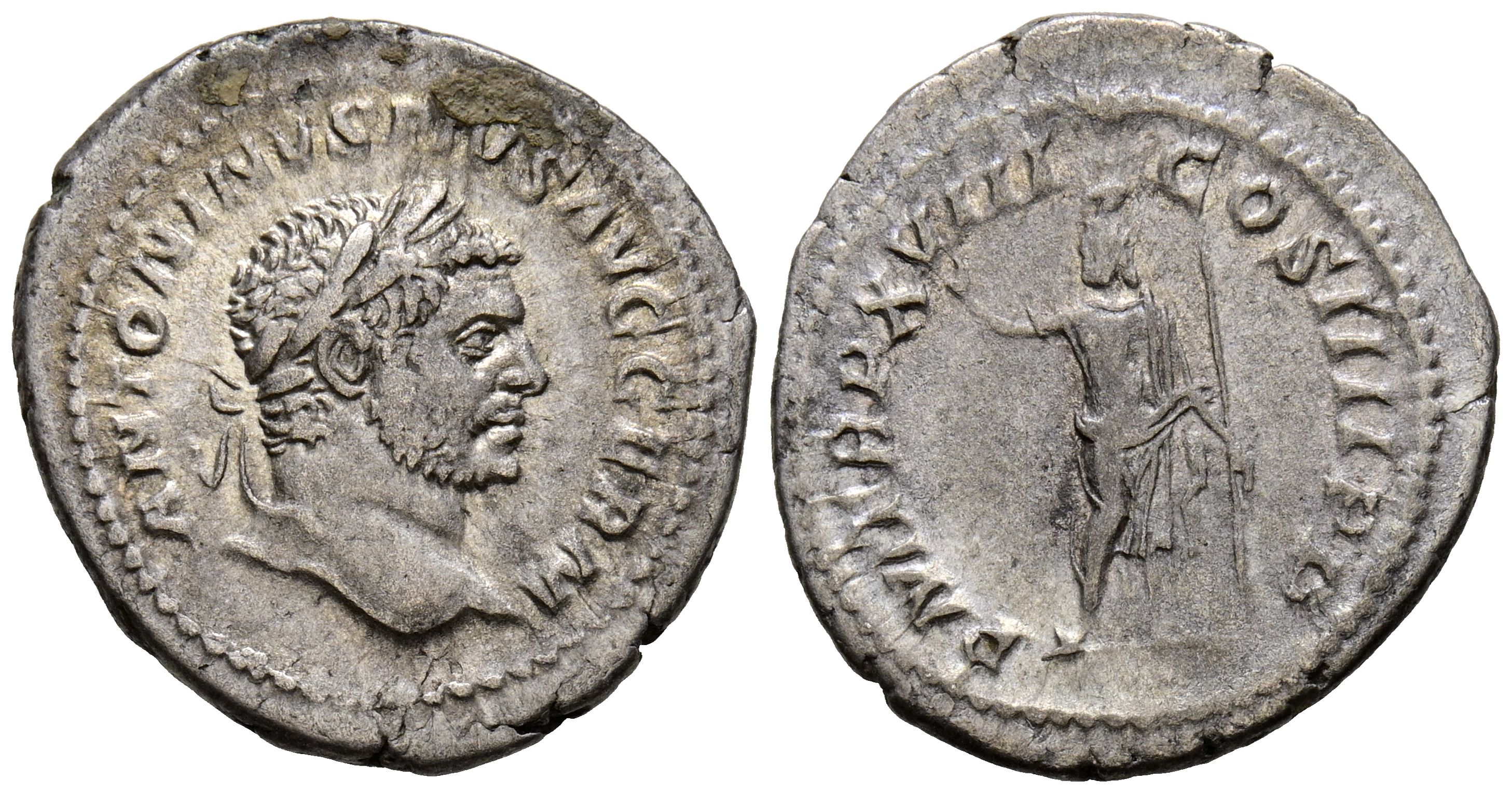 CARACALLA. Denario. (Ar. 3,14g/22mm). 216 d.C. Roma. (RIC 280c). Anv: Busto laureado de Caracalla a derecha, alrededor leyenda: ANTONINVS PIVS AVG GERM. Rev: Serapis estante a izquierda portando rama y cetro, alrededor leyenda: P M TR P XVIIII COS IIII P P. MBC