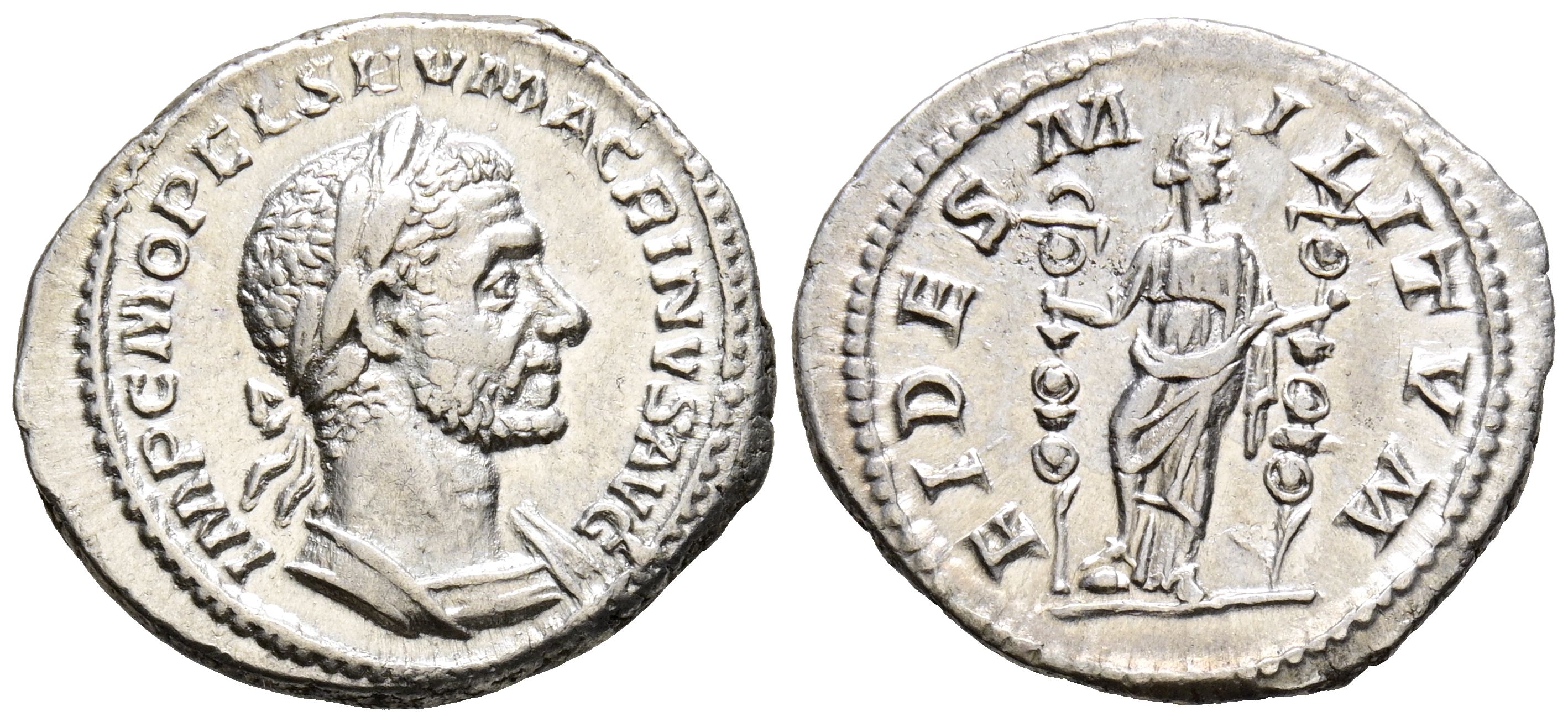 MACRINO. Denario. (Ar. 2,97g/20mm). 217 d.C. Roma. (RIC 34). Anv: Busto laureado y con coraza de Macrino a derecha, alrededor leyenda: IMP C M OPEL SEV MACRINVS AVG. Rev: Fides estante a derecha, sosteniendo dos estandartes, alrededor leyenda: FIDES MILITVM. EBC-. Bonito ejemplar, escaso así.