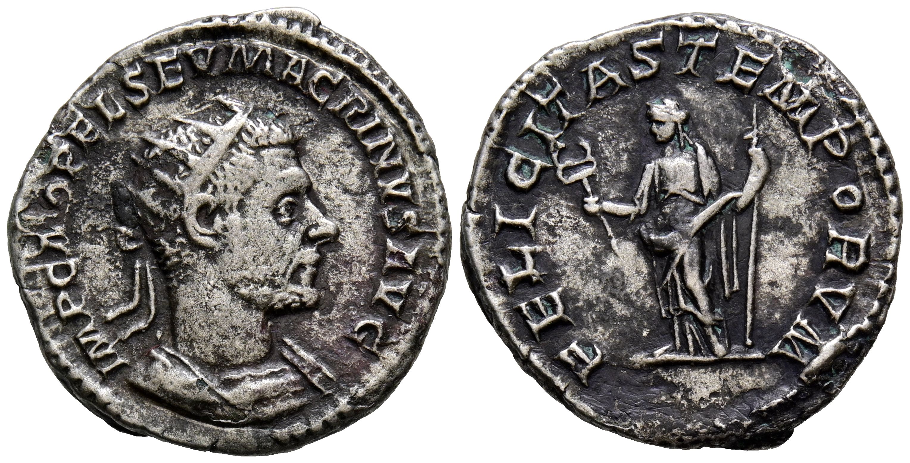 MACRINO. Antoniniano. (Ar. 3,91g/22mm). 217-218 d.C. Roma. (RIC 63). Anv: Busto radiado y con coraza de Macrino a izquierda, alrededor leyenda: IMP M C OPEL SEV MACRINVS AVG. Rev: Felicitas estante a izquierda portando caduceo y cetro, alrededor leyenda: FELICITAS TEMPORVM. MBC.