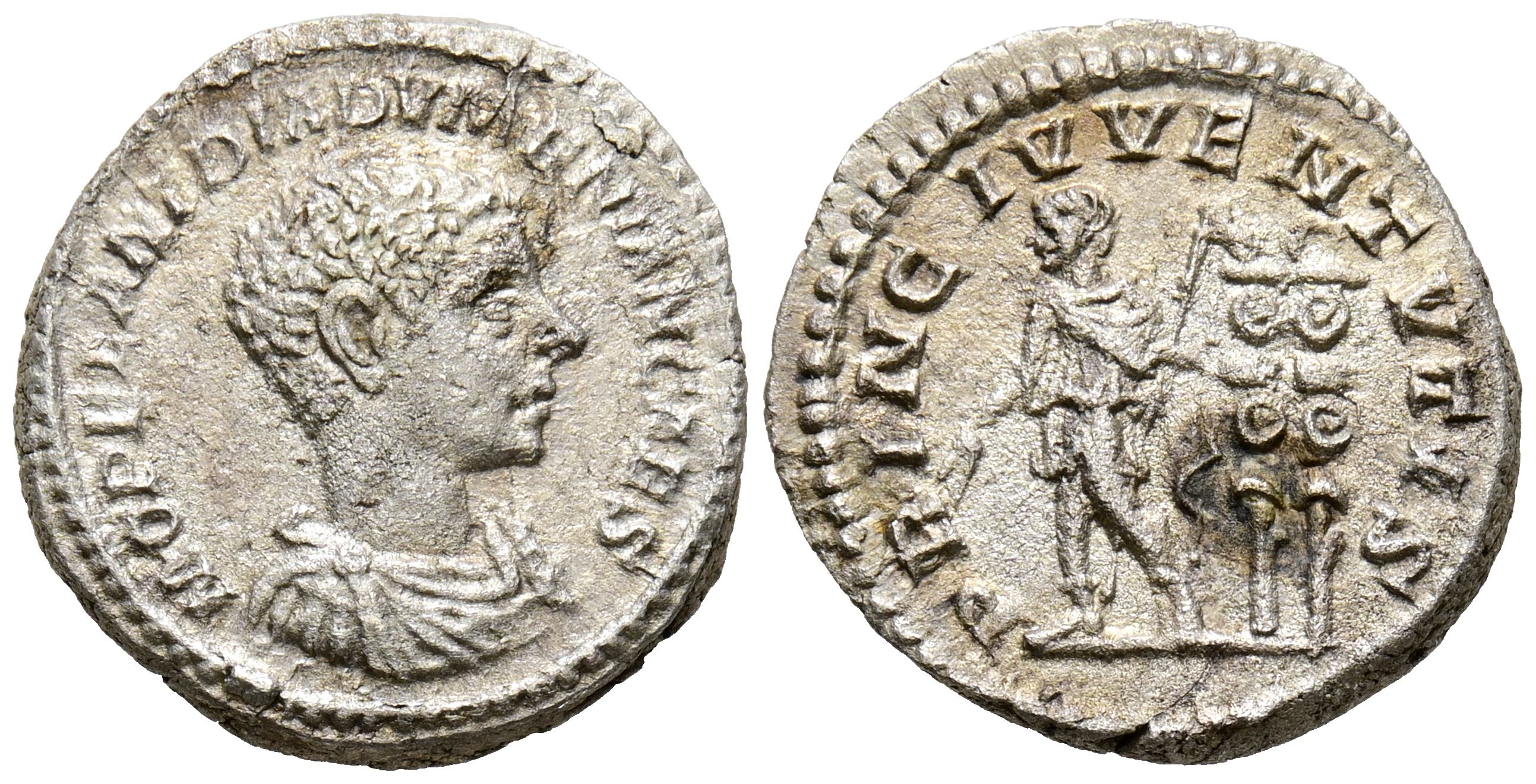 DIADUMENIANO. Denario. (Ar. 1,82g/18mm). 217-218 d.C. Roma. (RIC 107). Anv: Busto drapeado y con coraza de Diadumeniano a derecha, alrededor leyenda: M OPEL DIADVMENIAN CAES. Rev: Diadumeniano estante a izquierda con atuendo militar sosteniendo cetro, detrás dos estandartes, alrededor leyenda: PRINC IVVENTVTIS. MBC. Oxidaciones limpiadas.