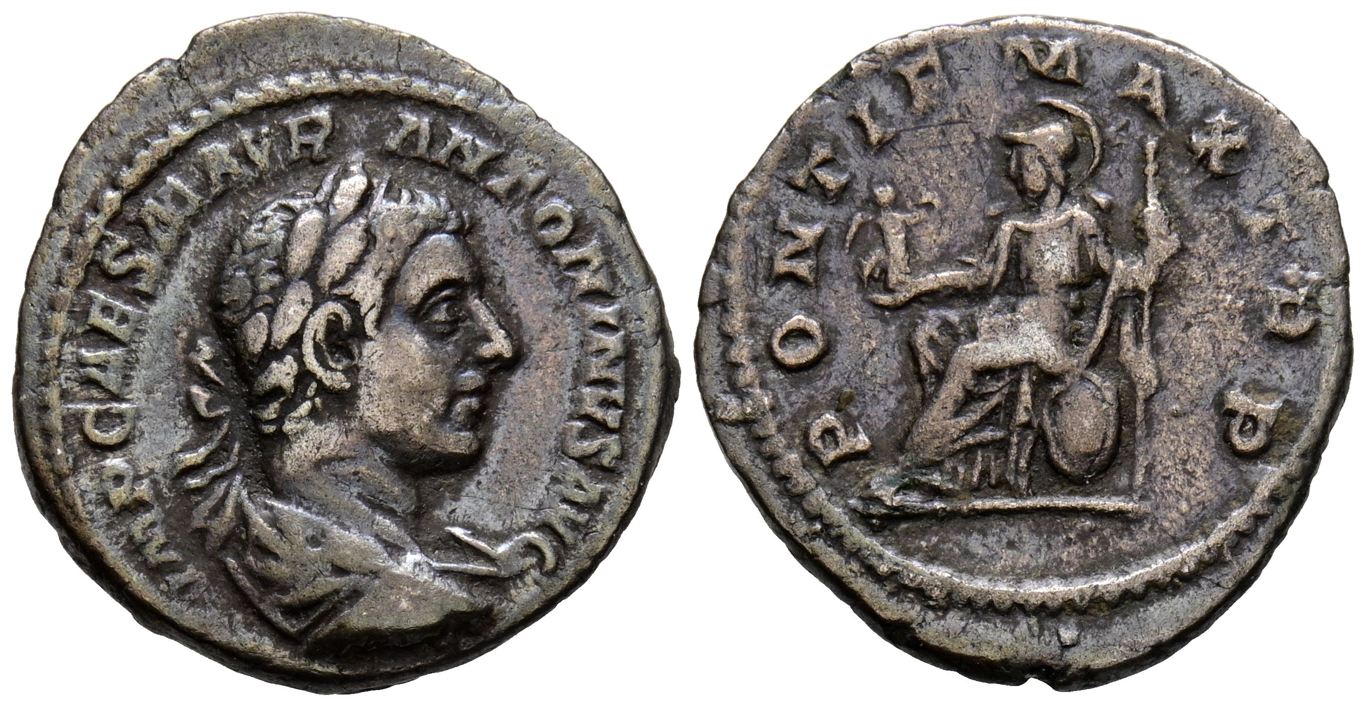 HELIOGABALO. Denario. (Ar. 2,40g/19mm). 218 d.C. Roma. (RIC 8). Anv: Busto laureado y drapeado de Heliogábalo a derecha, alrededor leyenda: IMP CAES M AVR ANTONINVS AVG. Rev: Roma sentada a izquierda portando lanza y Victoria con corona de laurel, a su espalda escudo, alrededor leyenda: PONTIF MAX TR P. MBC. Pátina.