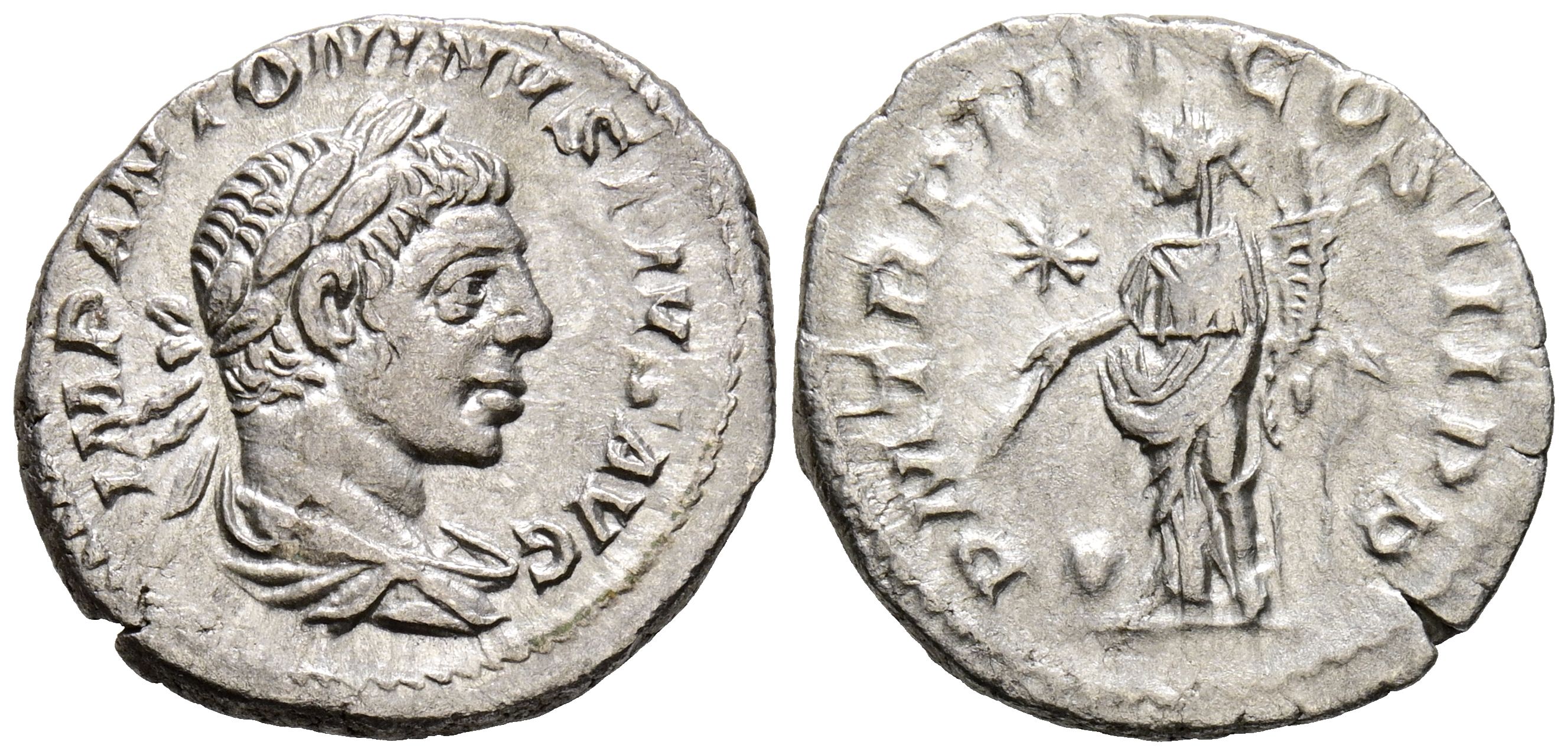 HELIOGABALO. Denario. (Ar. 2,48g/19mm). 221 d.C. Roma. (RIC 42). Anv: Busto laureado y drapeado de Heliogábalo a derecha, alrededor leyenda: IMP ANTONINVS PIVS AVG. Rev: Providentia estante a izquierda portando vara y cornucopia, a sus pies globo, en el campo estrella, alrededor leyenda: P M TR P IIII COS III P P. MBC.