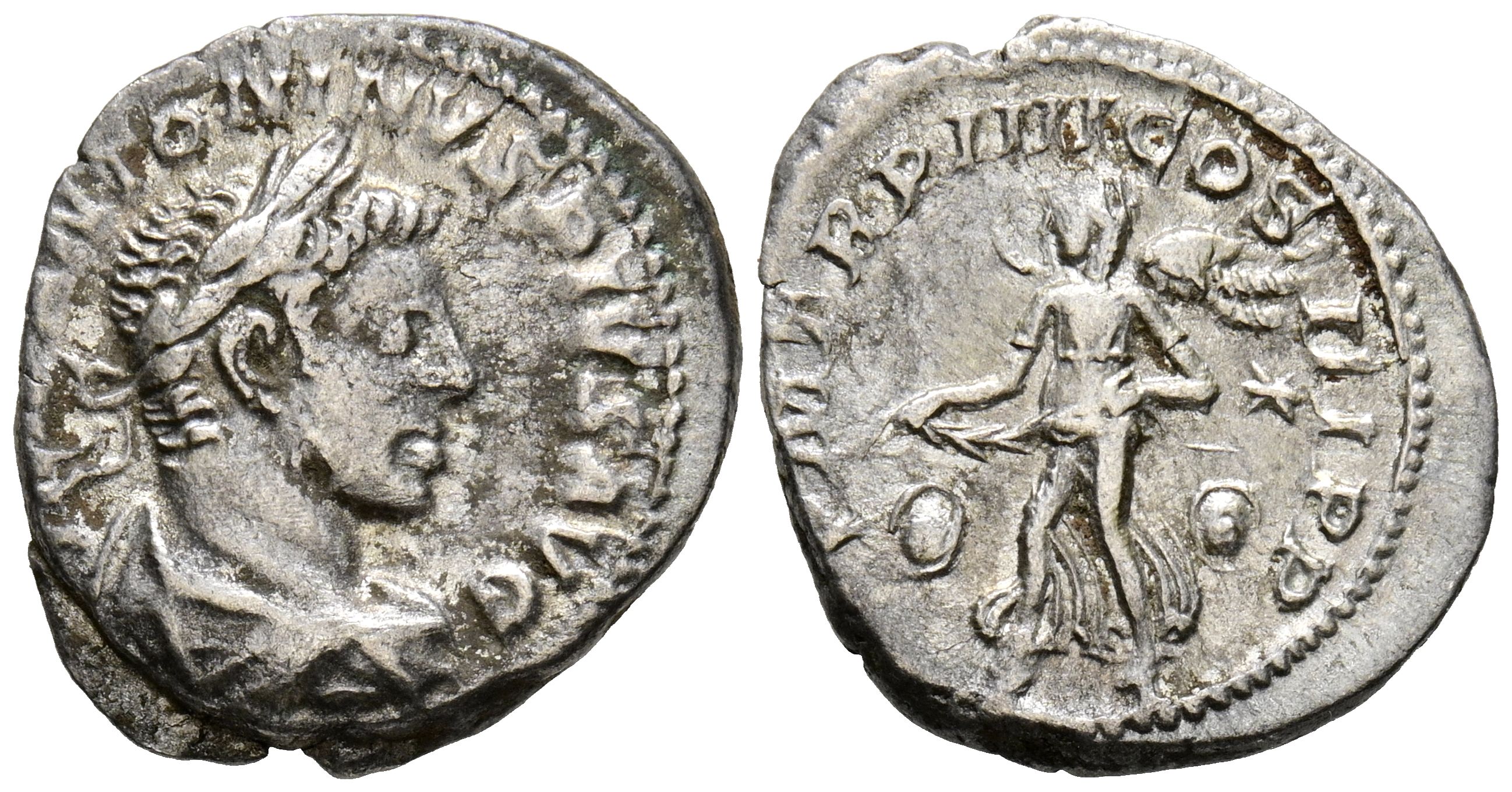 HELIOGABALO. Denario. (Ar. 3,63g/20mm). 221 d.C. Roma. (RIC 45). Anv: Busto laureado y drapeado de Heliogábalo a derecha, alrededor leyenda: IMP ANTONINVS PIVS AVG. Rev: Victoria avanzando a izquierda portando láurea, entre dos escudos, en campo estrella, alrededor leyenda: P M TR P IIII COS II P P. MBC.