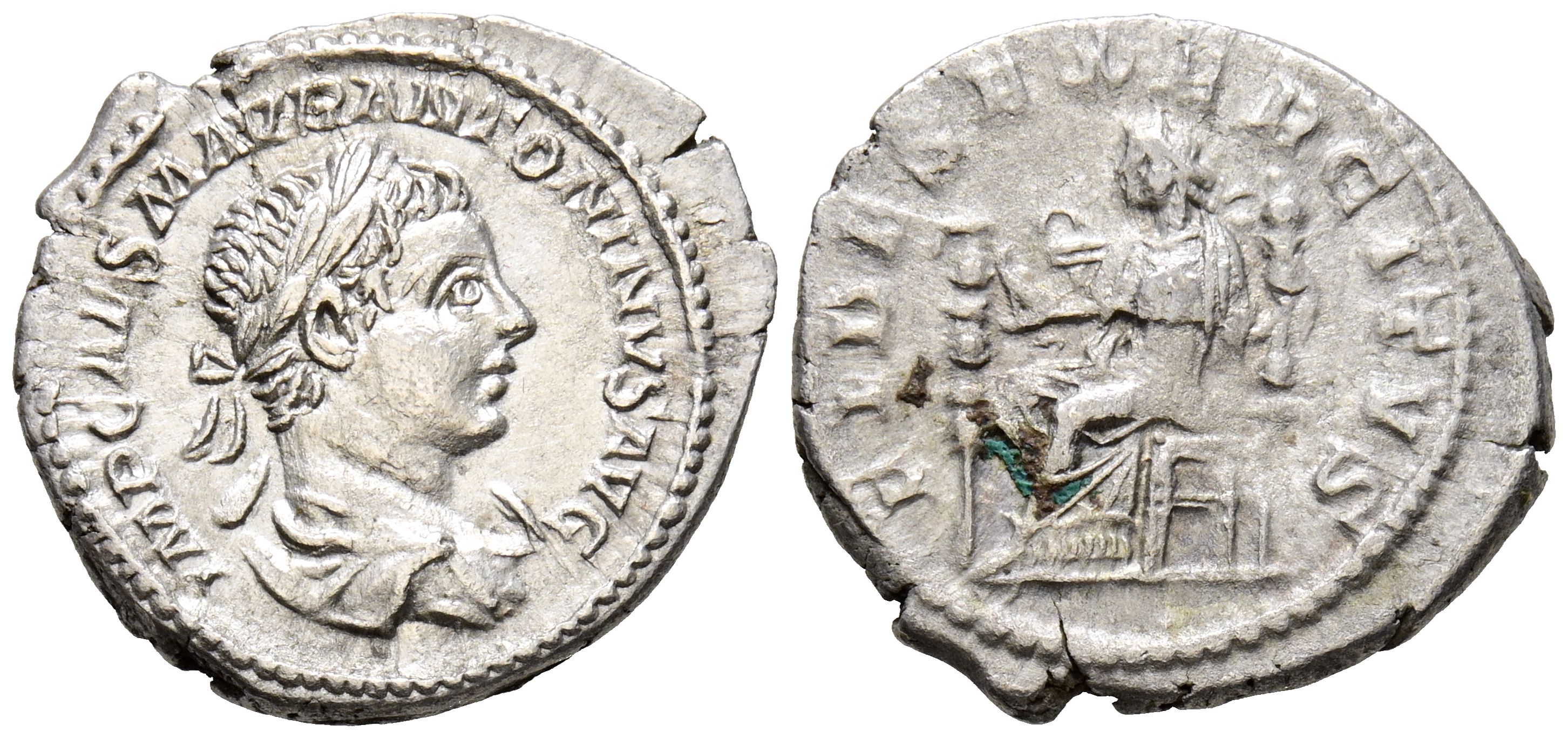 HELIOGABALO. Denario. (Ar. 2,94g/21mm). 218 d.C. (RIC 71). Anv: Busto laureado y drapeado de Heliogábalo a derecha, alrededor leyenda: IMP CAES M AVR ANTONINVS AVG. Rev: Fides sentado a izquierda portando águila, entre dos estandarte, alrededor leyenda: FIDES EXERCITVS. MBC+/MBC.