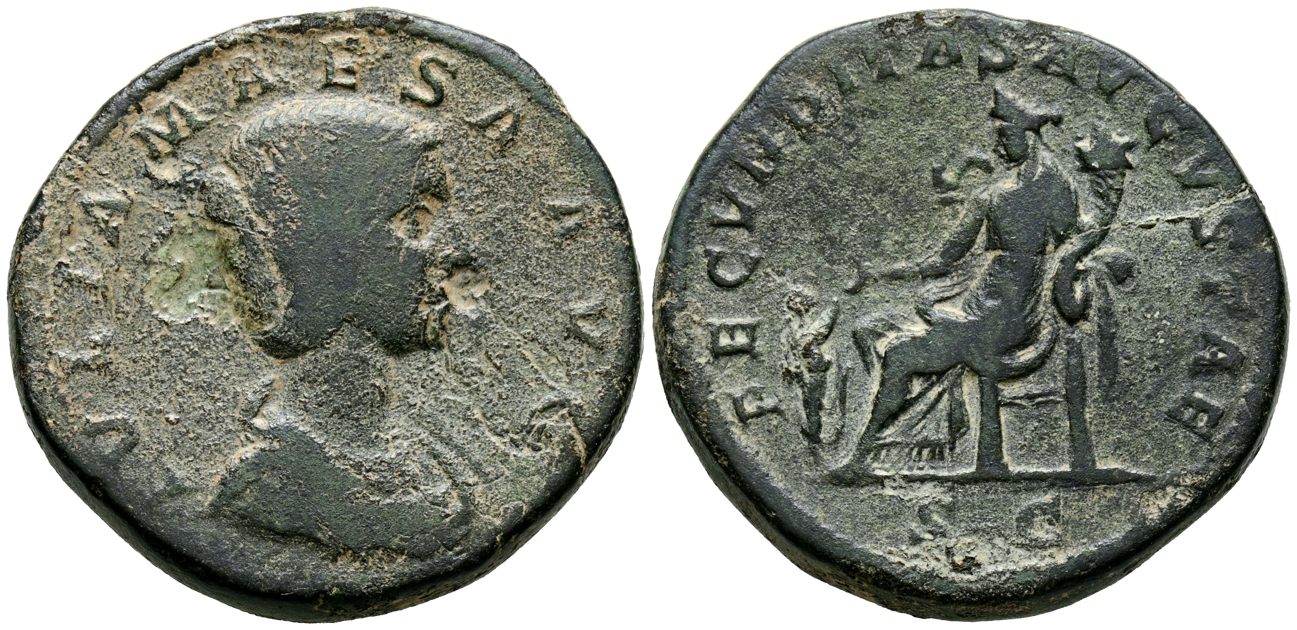 JULIA MAESA. Sestercio. (Ae. 22,05g/31mm). 218-224 d.C. Roma. (RIC 410). Anv: Busto drapeado de Julia Maesa a derecha, alrededor leyenda: IVLIA MAESA AVG. Rev: Fecunditas sentada a izquierda portando cornucopia y dando la mano a un niño a sus pies, en exergo: SC, alrededor leyenda: FACVNDITAS AVGVSTAE. MBC-.