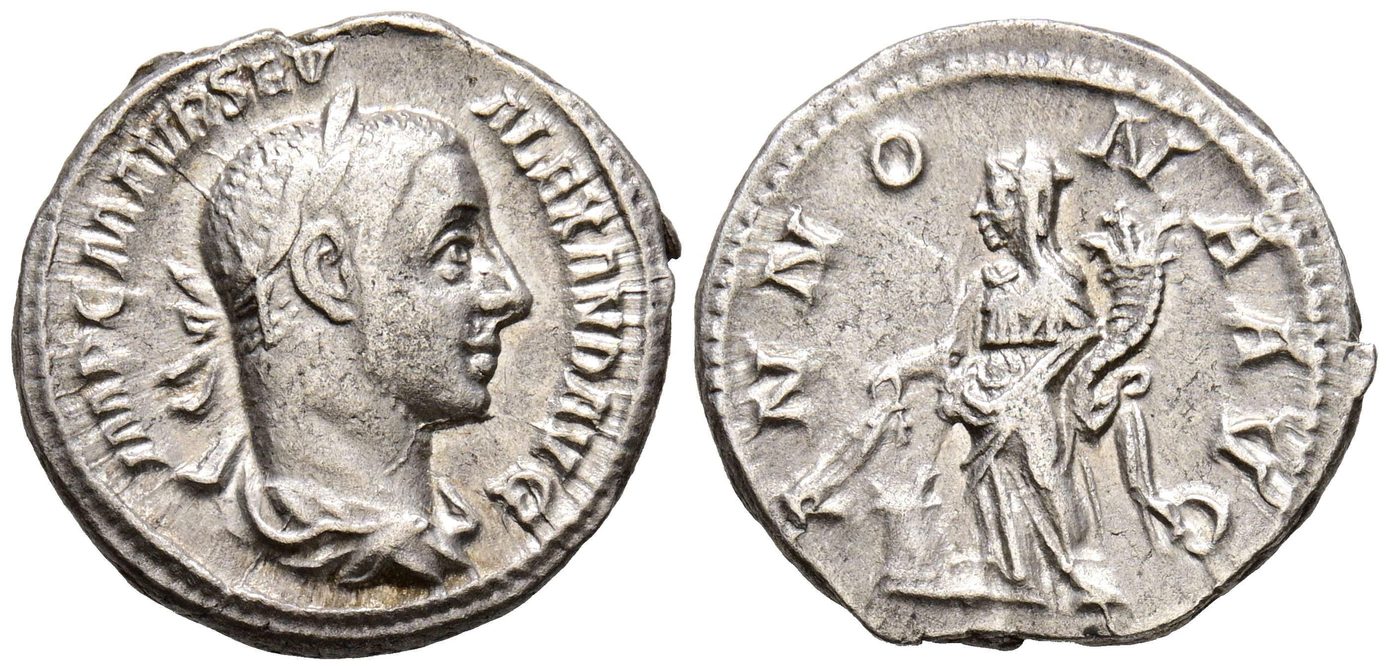ALEJANDRO SEVERO. Denario. (Ar. 3,72g/19mm). 228 d.C. Roma. (RIC 135). Anv: Busto laureado y drapeado de Alejandro Severo a derecha, alrededor leyenda: IMP C M AVR SEV ALEXAND AVG. Rev: Annona estante a izquierda portando espigas sobre modio y cornucopia, alrededor leyenda: ANNONA AVG. MBC+.