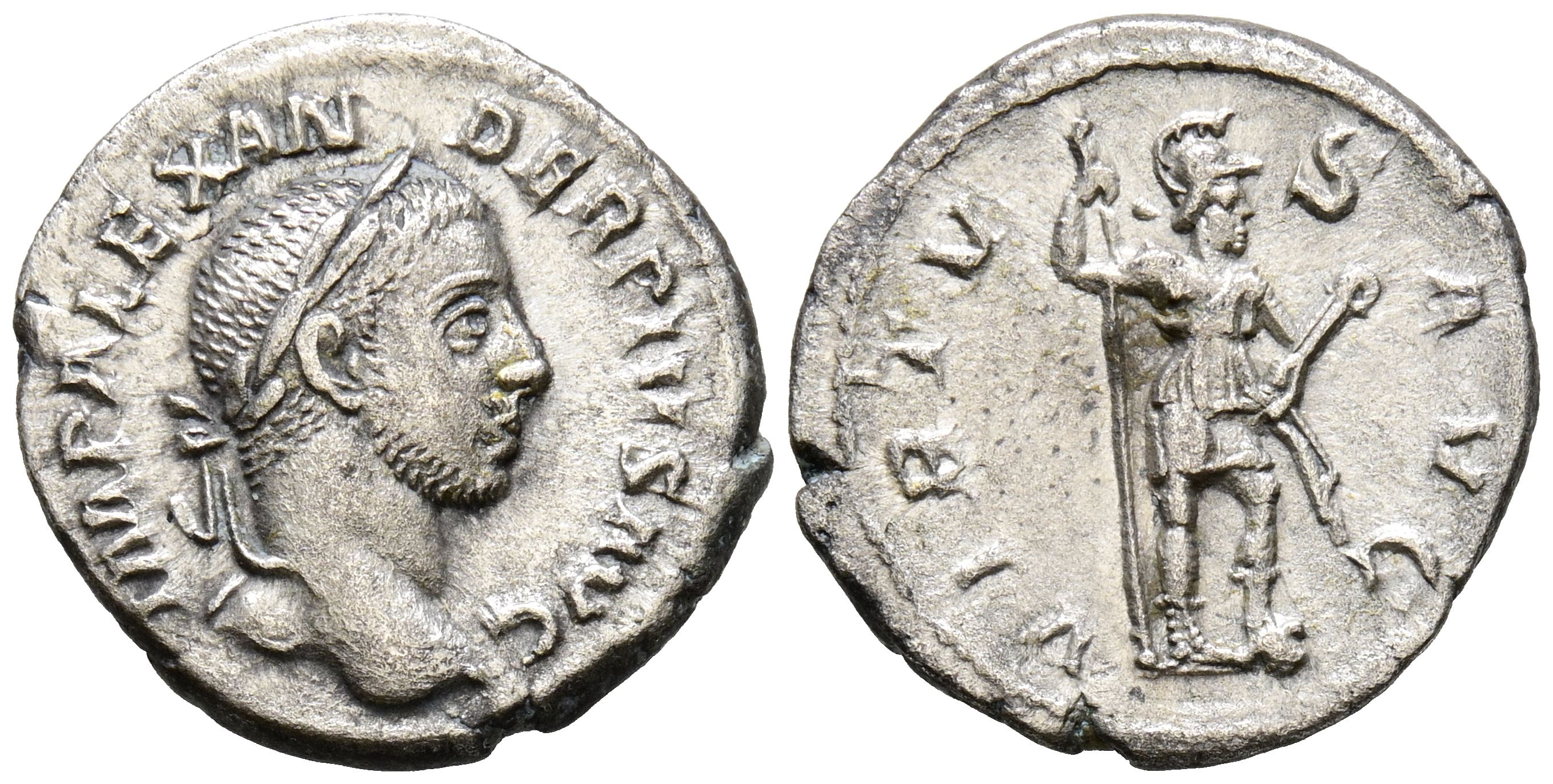 ALEJANDRO SEVERO. Denario. (Ar. 3,40g/19mm). 222-228 d.C. Roma. (RIC 182). Anv: Busto laureado y drapeado de Alejandro Severo a derecha, alrededor leyenda: IMP C M AVR SEV ALEXAND AVG. Rev: Virtus estante a izquierda portando lanza y escudo, alrededor leyenda: VIRTVS AVG. MBC-.