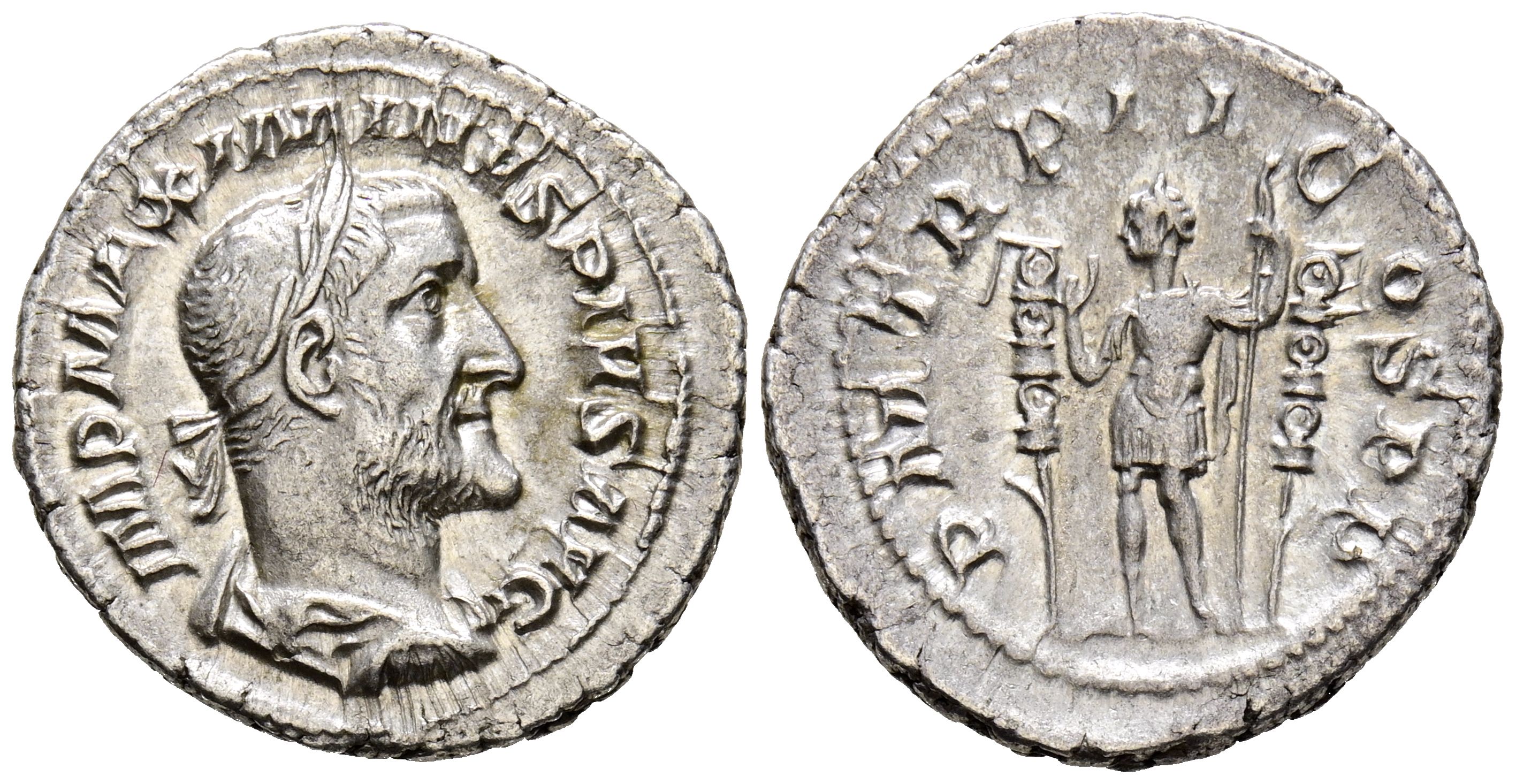 MAXIMIANO I. Denario. (Ar. 3,05g/20mm). 235-236 d.C. Roma. (RIC 3). Anv: Busto laureado y drapeado de Maximiano I a derecha, alrededor leyenda: IMP MAXIMIANVS PIVS AVG. Rev: Maximiano I estante a izquierda portando cetro entre dos estandartes, alrededor leyenda: P M TR P II COS P P. MBC+. Bonito ejemplar.