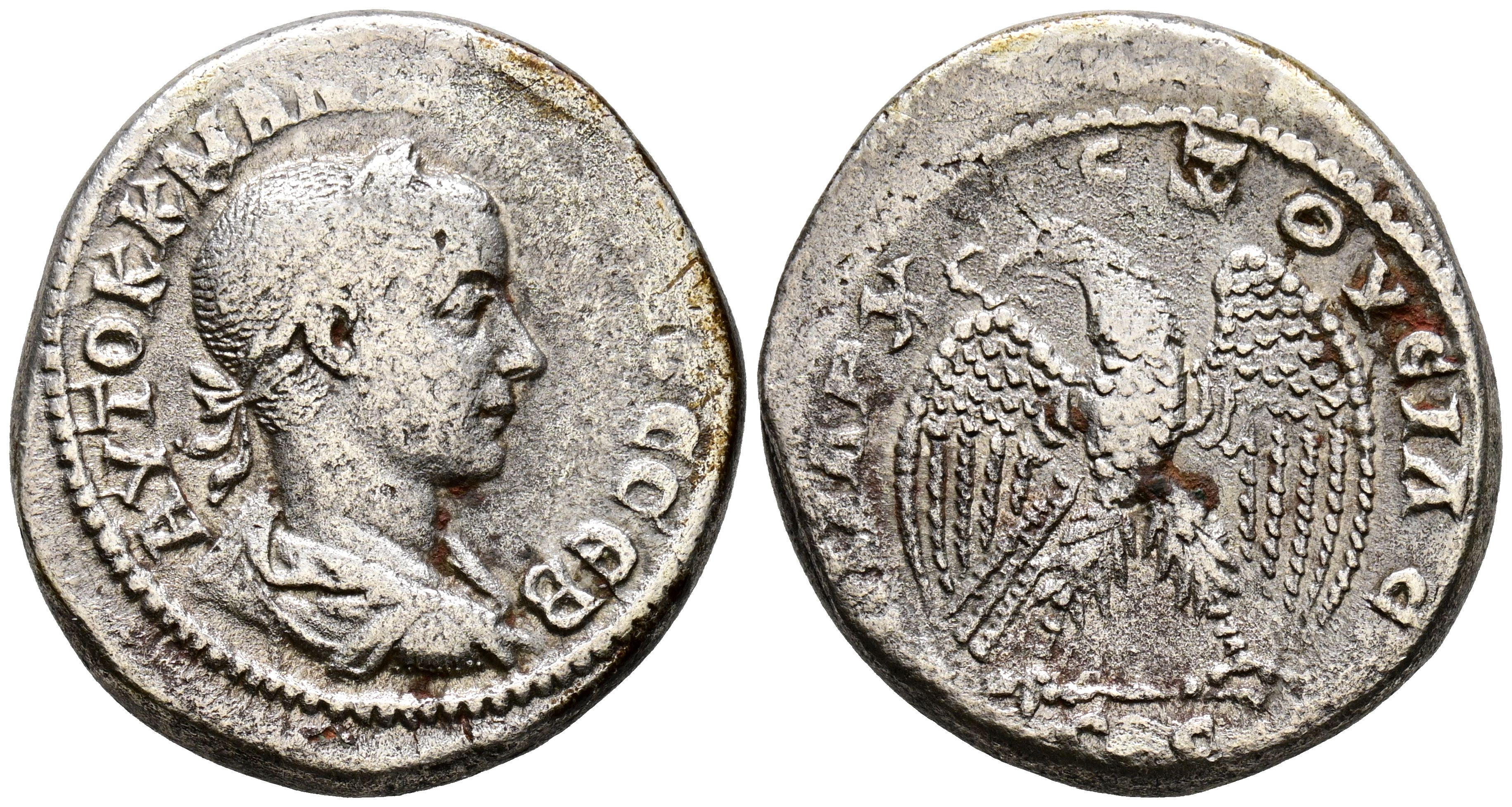 GORDIANO III. Tetradracma. (Ar. 12,90g/27mm). 238-240 d.C. Antioquía. (RPC 3488). Anv: Busto laureado y drapeado de Gordiano III a derecha, alrededor leyenda griega. Rev: Aguila estante a izquierda con corona de laurel, debajo SC, alrededor leyenda griega. MBC.