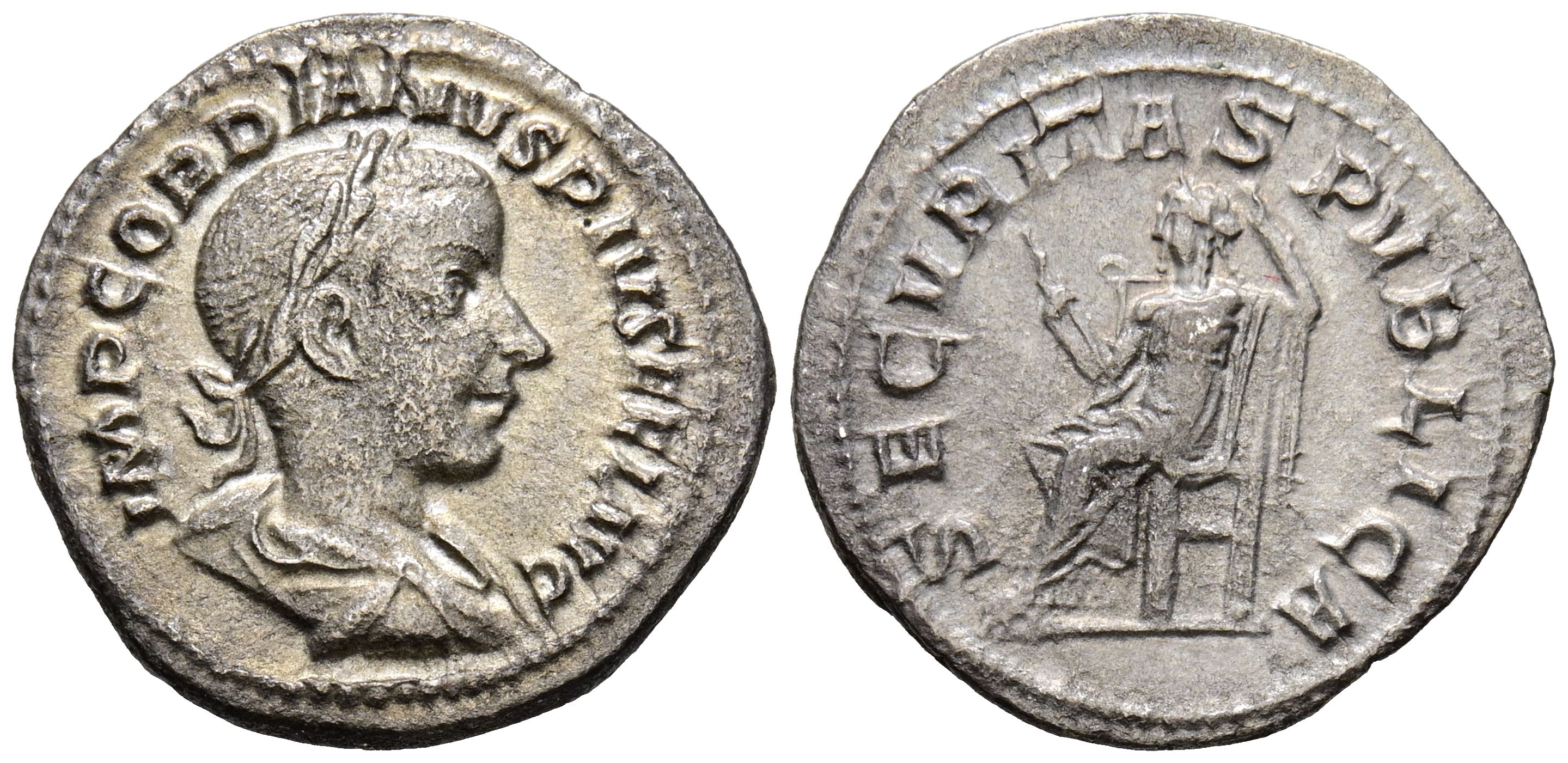 GORDIANO III. Denario. (Ar. 2,54g/20mm). 241 d.C. Roma. (RIC 130). Anv: Busto laureado y drapeado de Gordiano III a derecha, alrededor leyenda: IMP GORDIANVS PIVS FEL AVG. Rev: Securtias sentada a izquierda portando cetro, alrededor leyenda: SECVRITAS PVBLICA. MBC+.