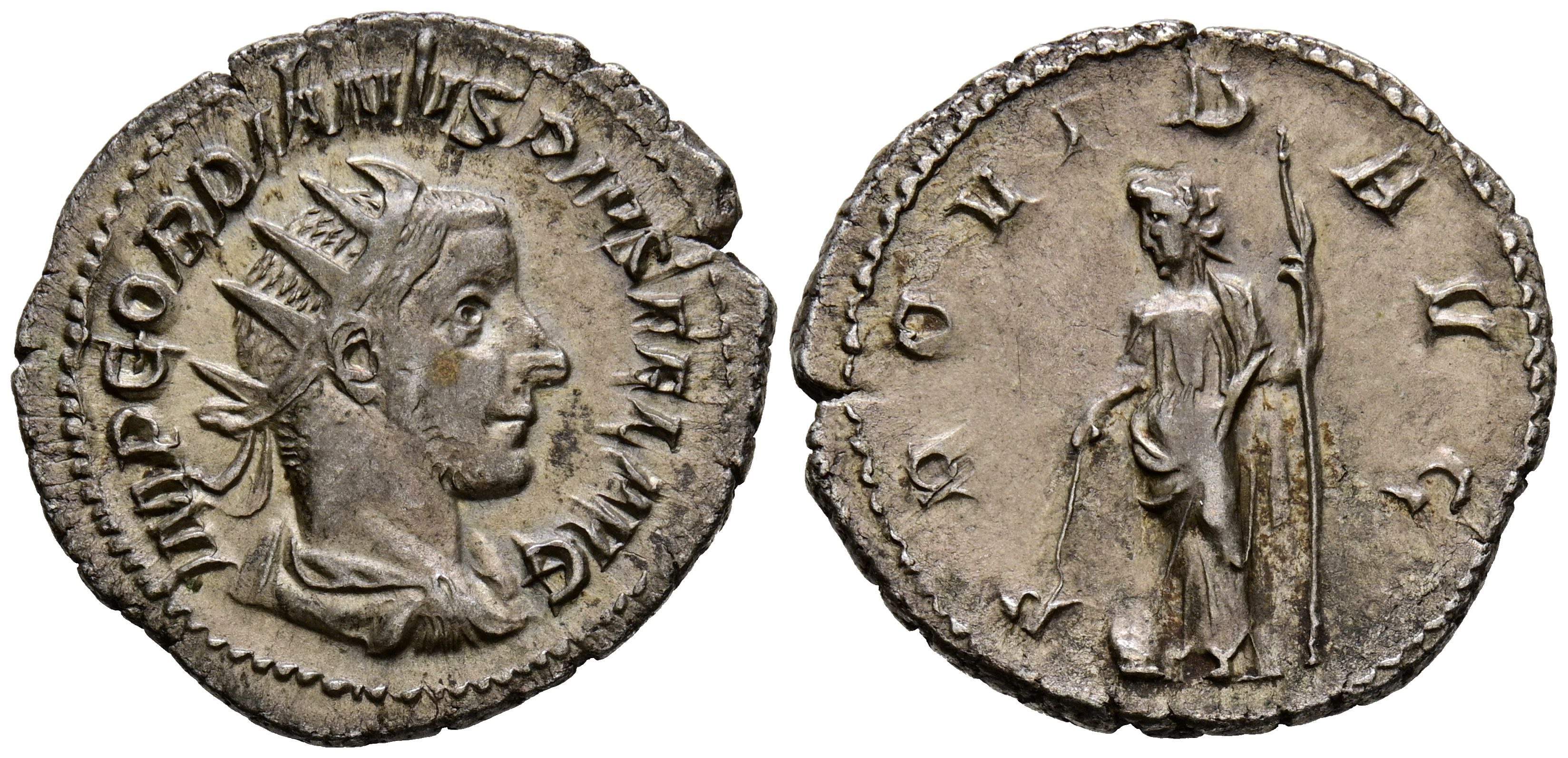 GORDIANO III. Antoniniano. (Ar. 3,66g/23mm). 243-244 d.C. Roma. (RIC 148). Anv: Busto radiado y drapeado de Gordiano III a derecha, alrededor leyenda: IMP GORDIANVS PIVS FEL AVG. Rev: Providentia estante a izquierda portando cetro y vara, alrededor leyenda: PROVID AVG. MBC+.