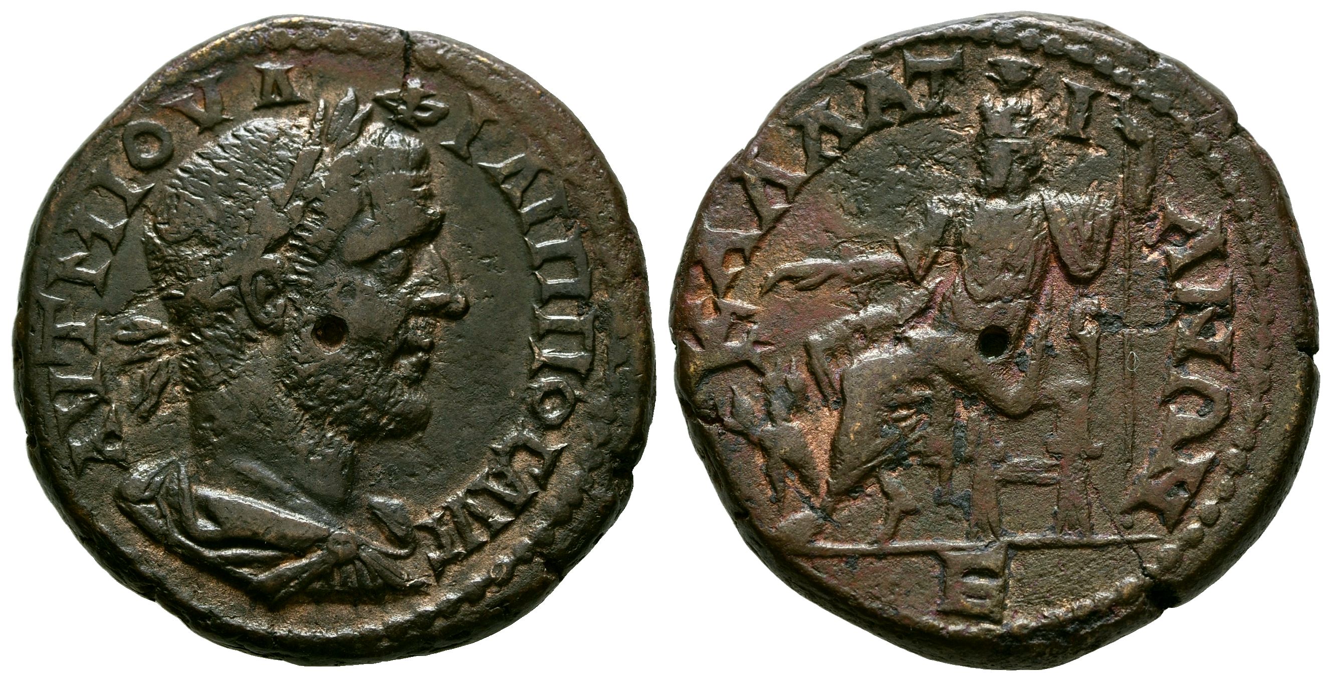 FILIPO I. Pentassarion. (Ae. 12,84g/27mm). 244-249 d.C. Callatis. (Varbanov 387). Anv: Busto laureado y drapeado de Filipo I a derecha, alrededor leyenda griega. Rev: Cibeles sentada a izquierda portando patera y apoyando codo sobre tambor, en exergo: E, alrededor leyenda griega. MBC.
