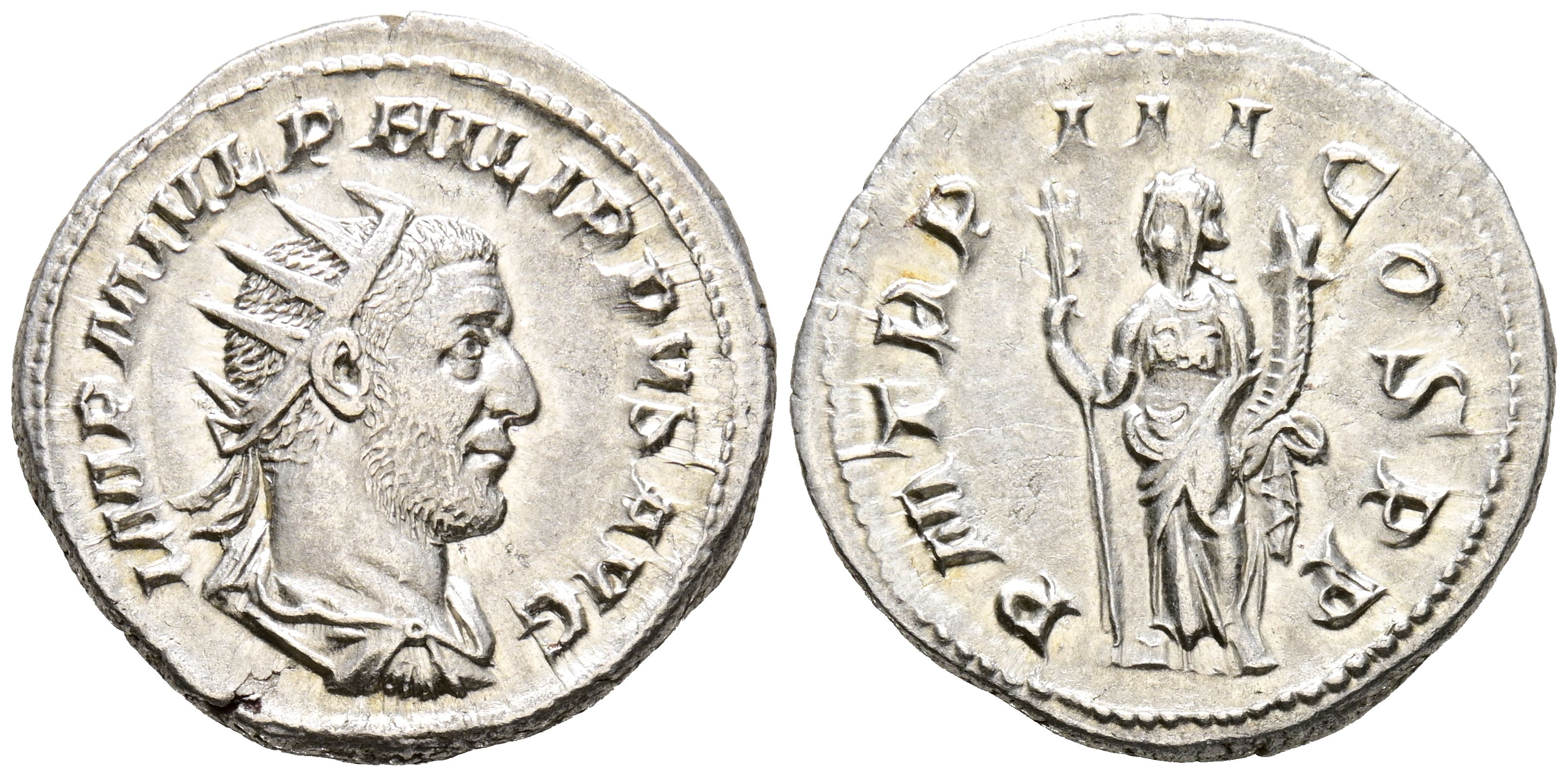 FILIPO I. Antoniniano. (Ar. 4,43g/22mm). 246 d.C. Roma. (RIC 3). Anv: Busto radiado y drapeado de Filipo I a derecha, alrededor leyenda: IMP M IVL PHILIPPVS AVG. Rev: Felicitas estante a izquierda portando caduceo y cornucopia, alrededor leyenda: P M TR P III COS P P. EBC+/EBC. Restos de brillo original.