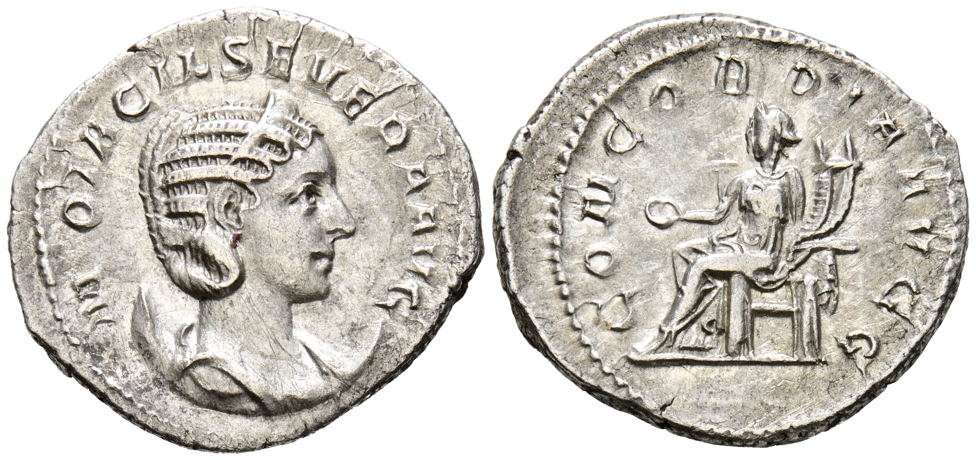 OTACILIA SEVERA. Antoniniano. (Ar. 4,06g/23mm). 247 d.C. Roma. (RIC 125c). Anv: Busto diademado y drapeado de Otacilia Severa a derecha sobre creciente, alrededor leyenda: M OTACIL SEVERA AVG. Rev: Concordia sentada a izquierda portando patera y doble cornucopia, alrededor leyenda: CONCORDIA AVGG. MBC+.