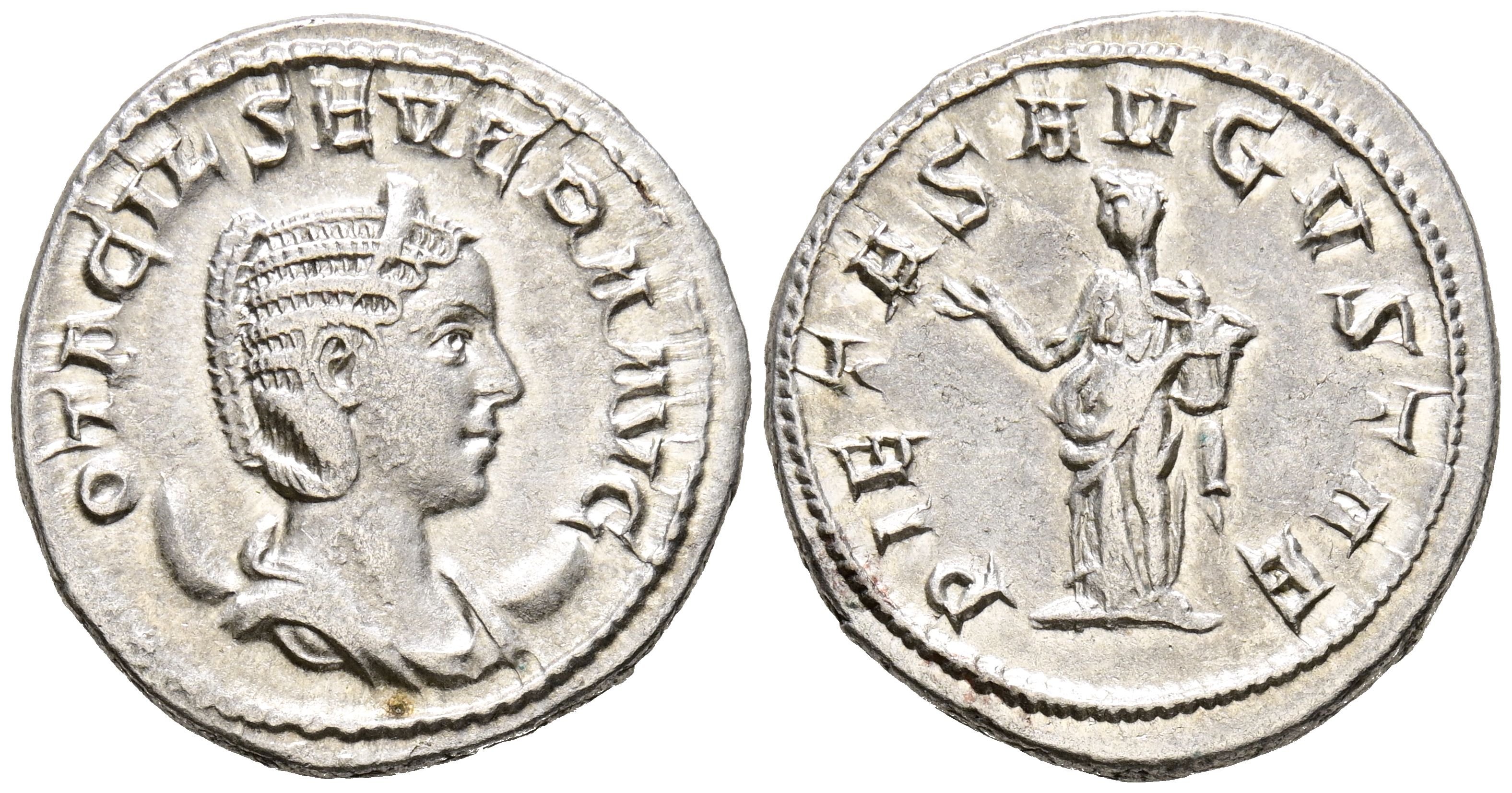 OTACILIA SEVERA. Antoniniano. (Ar. 4,64g/23mm). 248 d.C. Roma. (RIC 130). Anv: Busto diademado y drapeado de Otacilia Severa sobre creciente, alrededor leyenda: OTACIL SEVERA AVG. Rev: Pietas velada estanta a izquierda portando caja de incienso y alzando mano derecha alrededor leyenda: PIETAS AVGG. EBC. Restos de brillo original.