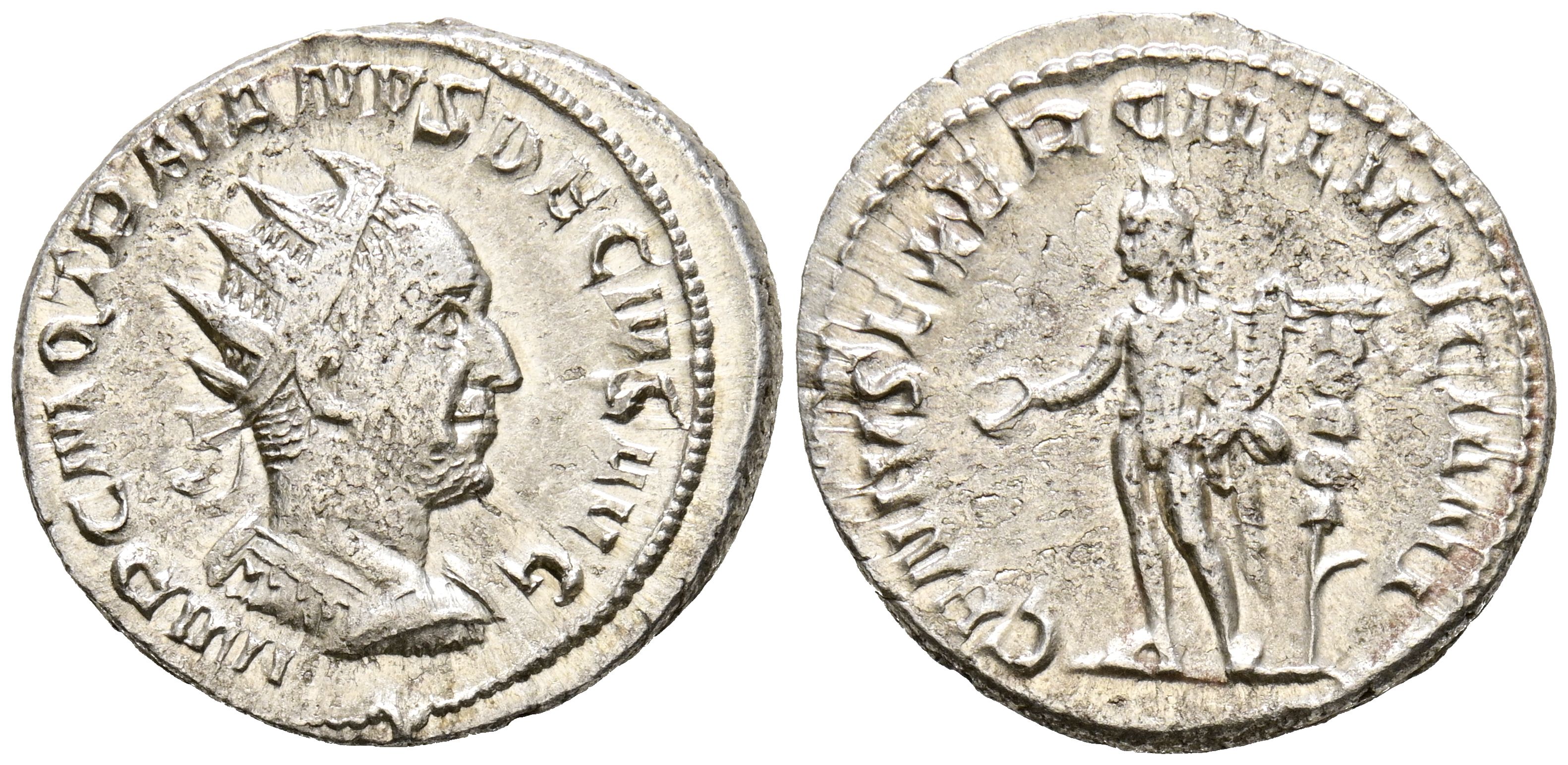 TRAJANO DECIO. Antoniniano. (Ar. 4,16g/22mm). 249-251 d.C. Roma. (RIC 16c). Anv: Busto radiado y drapeado de Trajano Decio a derecha, alrededor leyenda: IMP C M Q TRAIANVS DECIVS AVG. Rev: Genio estante a izquierda portando patera y cornucopia, detrás estandarte, alrededor leyenda: GENIVS EXERC ILLVRICIANI. MBC+.