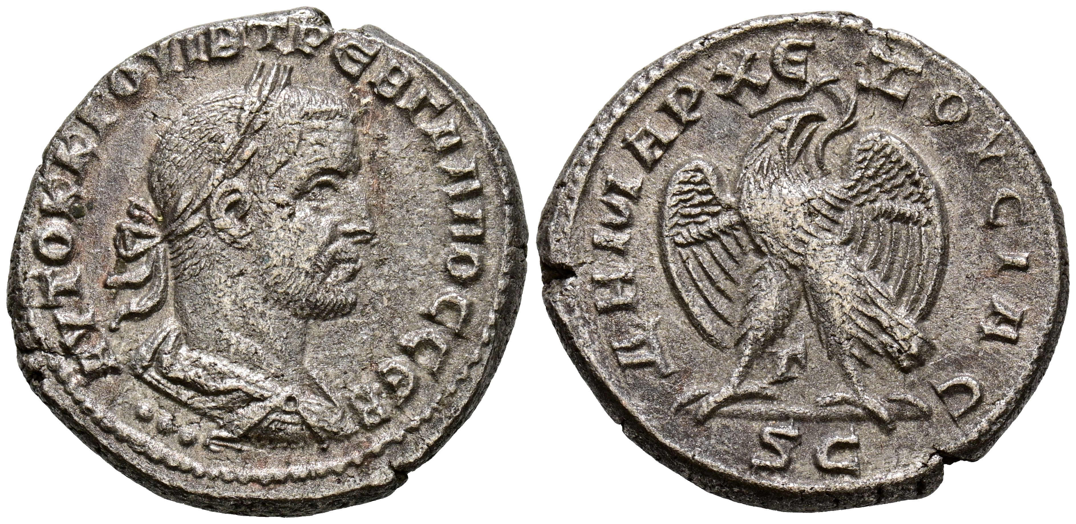 TREBONIANO GALO. Tetradracma. (Ar. 9,86g/26mm). 251-253 d.C. (RPC 1798). Anv: Busto laureado y drapeado de Treboniano Galo, detrás tres puntos, alrededor leyenda griega. Rev: Aguila estante de frente mirando a derecha con corona de laurel, entre las patas r, en exergo: SC, alrededor leyenda griega. MBC.