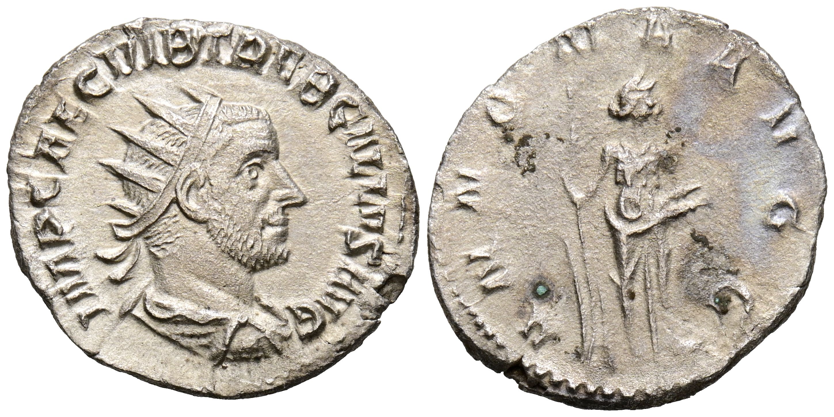 TREBONIANO GALO. Antoniniano. (Ar. 2,58g/21mm). 253 d.C. Roma. (RIC 31). Anv: Busto radiado y drapeado de Treboniano Galo a derecha, alrededor leyenda: IMP CAE C VIB TREB GALLVS AVG. Rev: Annona estante a derecha portando timón y espigas, alrededor leyenda: ANNONA AVGG. MBC+/MBC.