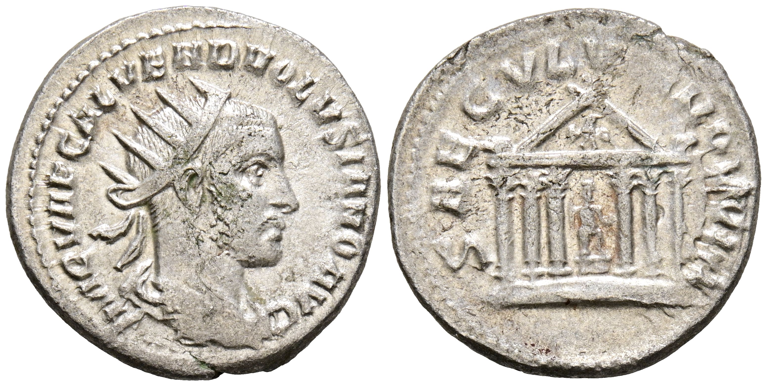VOLUSIANO. Antoniniano. (Ar. 4,16g/22mm). 252-253 d.C. Roma. (RIC 235). Anv: Busto radiado y drapeado de Volusiano a derecha, alrededor leyenda: IMP C V AF GAL VEND VOLVSIANO AVG. Rev: Estatua de Roma con cetro detro de templo hexástilo, alrededor leyenda: SAECVLVM NOVVM. MBC+.