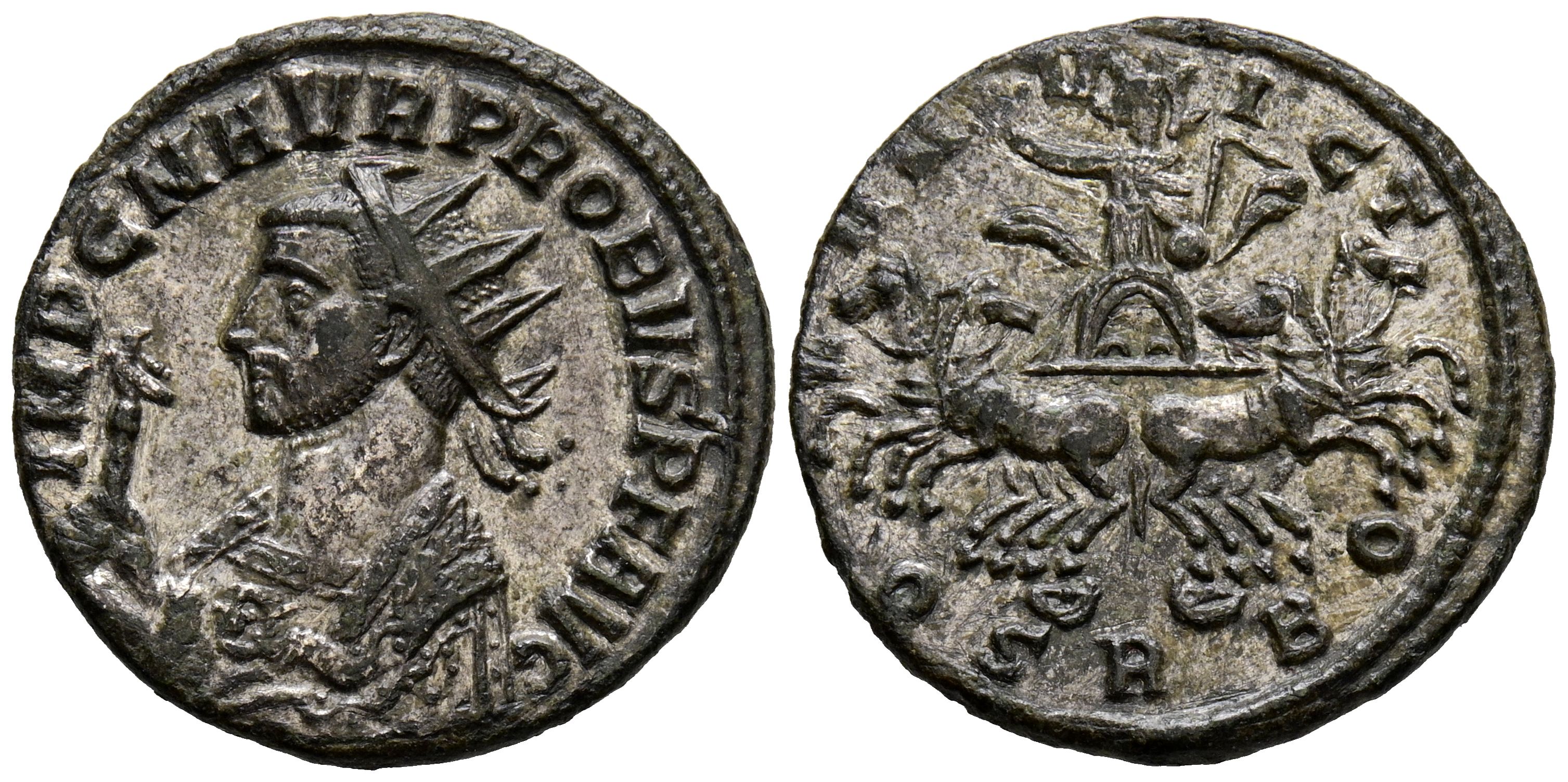 PROBO. Antoniniano. (Ve. 3,41g/21mm). 276-282 d.C. Roma. (RIC 204). Anv: Busto radiado y con coraza de Probo a izquierda portando cetro con águila, alrededor leyenda: IMP C M AVR PROBVS P F AVG. Rev: Sol con látigo y alzando mano derecha conduciendo sol de frente, debajo: BR, alrededor leyenda: SOL INVICTO. EBC. Restos de plateado original.
