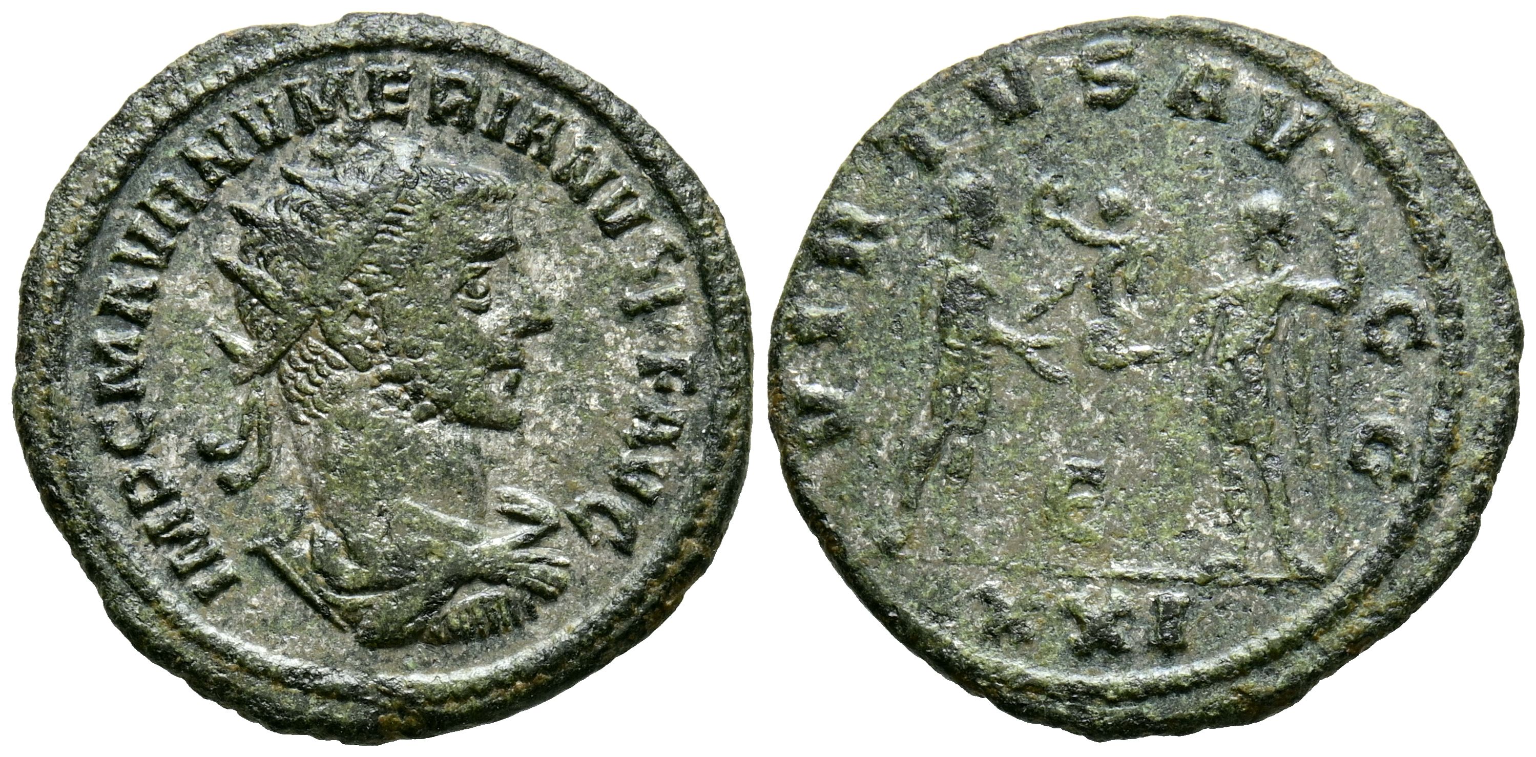 NUMERIANO. Antoniniano. (Ve. 3,00g/21mm). 283-284 d.C. Antioquía. (RIC 466). Anv: Busto radiado y drapeado de Numeriano a derecha, alrededor leyenda: IMP C M AVR NVMERIANVS P F AVG. Rev: Numeriano estante a derecha portando cetro y recibiendo Victoria con corona de laurel sobre globo de Júpiter estante a izquierda portando cetro, entre ellos E, en exergo: XXI, alrededor leyenda: VIRTVS AVGG. MBC+/MBC. Ligeros restos de plateado original.