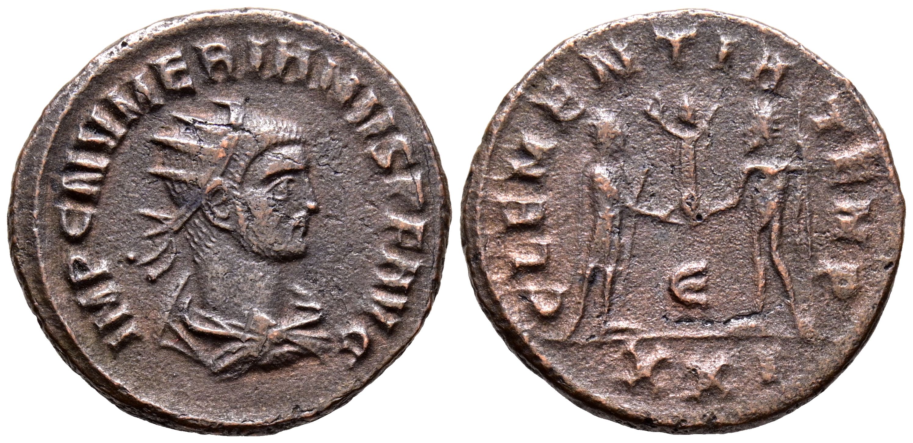 NUMERIANO. Antoniniano. (Ae. 3,40g/21mm). Cícico. (RIC 473). Anv: Busto radiado y drapeado de Numeriano a derecha, alrededor leyenda: IMP C NVMERIANVS P F AVG. Rev: Numeriano estante a derecha recibiendo Victoria con corona de laurel de Júpiter estante a izquierda portando cetro, entre ellos A, en exergo: XXI, alrededor leyenda: CLEMENTIA TEMP. MBC/MBC-.