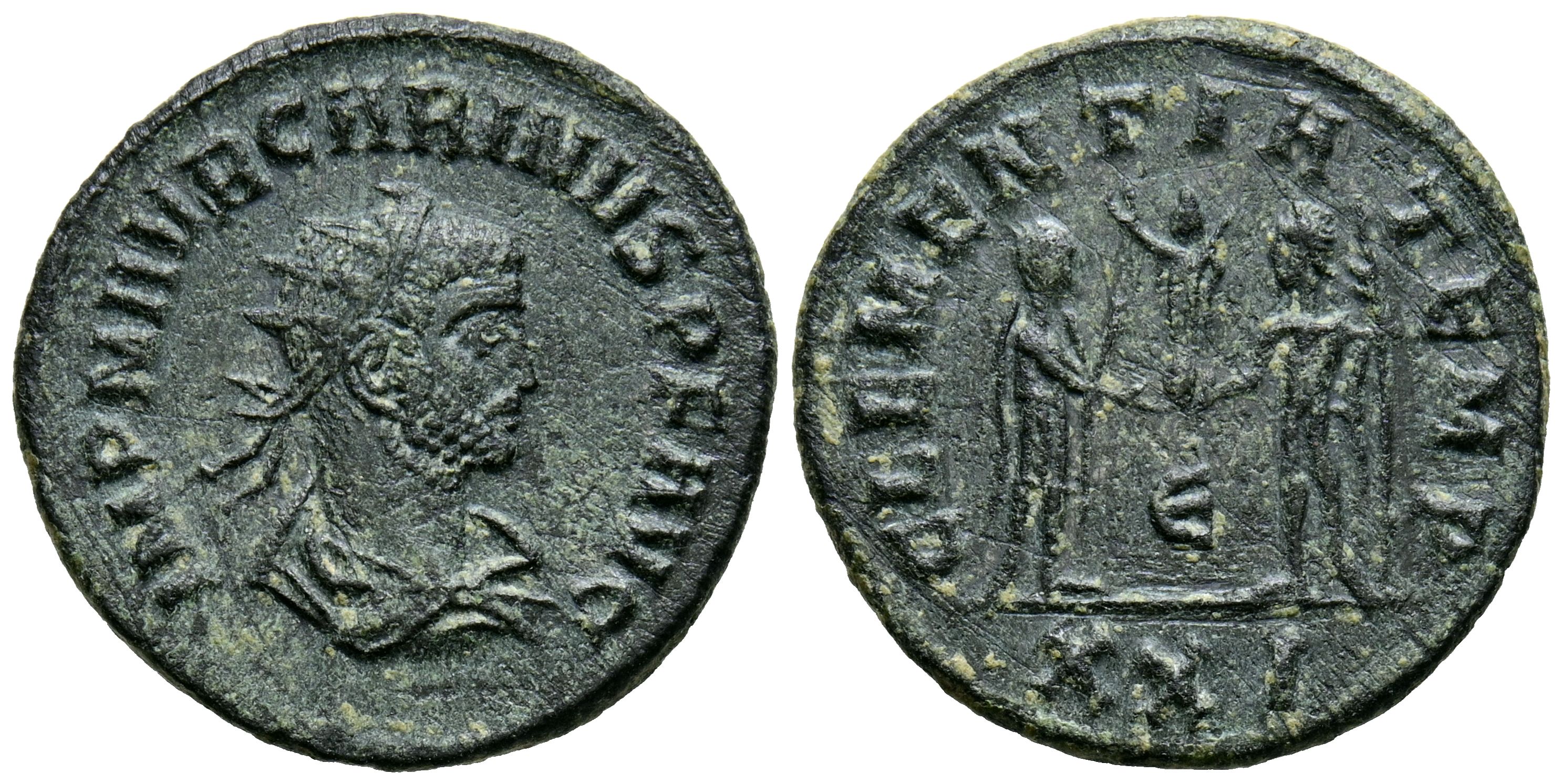 CARINO. Antoniniano. (Ae. 3,56g/21mm). 283-285 d.C. Cícico. (RIC 234). Anv: Busto radiado y drapeado de Carino a derecha, alrededor leyenda: IMP M AVR CARINVS P F AVG. Rev: Carino estante a derecha recibiendo Victoria de Júpiter estante a izquierda portando cetro, entre ellos E, en exergo: XXI, alrededor leyenda: CLEMENTIA TEMP. MBC.