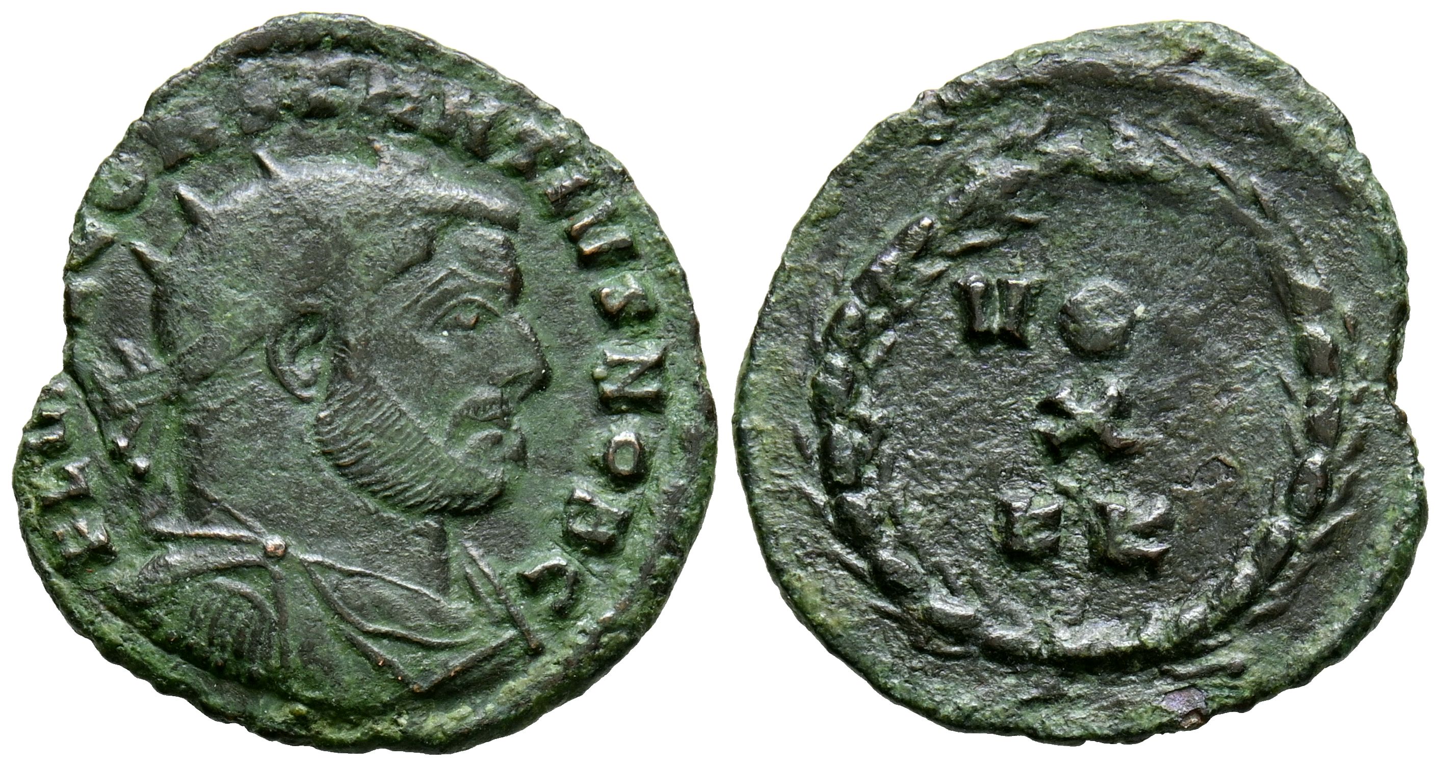 CONSTANCIO I. Follis. (Ae. 2,31g/22mm). 303 d.C. Cártago. (RIC 35a). Anv: Busto radiado y con coraza, alrededor leyenda: FL VAL CONSTANTIVS NOB C. Rev: Leyenda: VOT/X/KK, dentro de corona de laurel. MBC.
