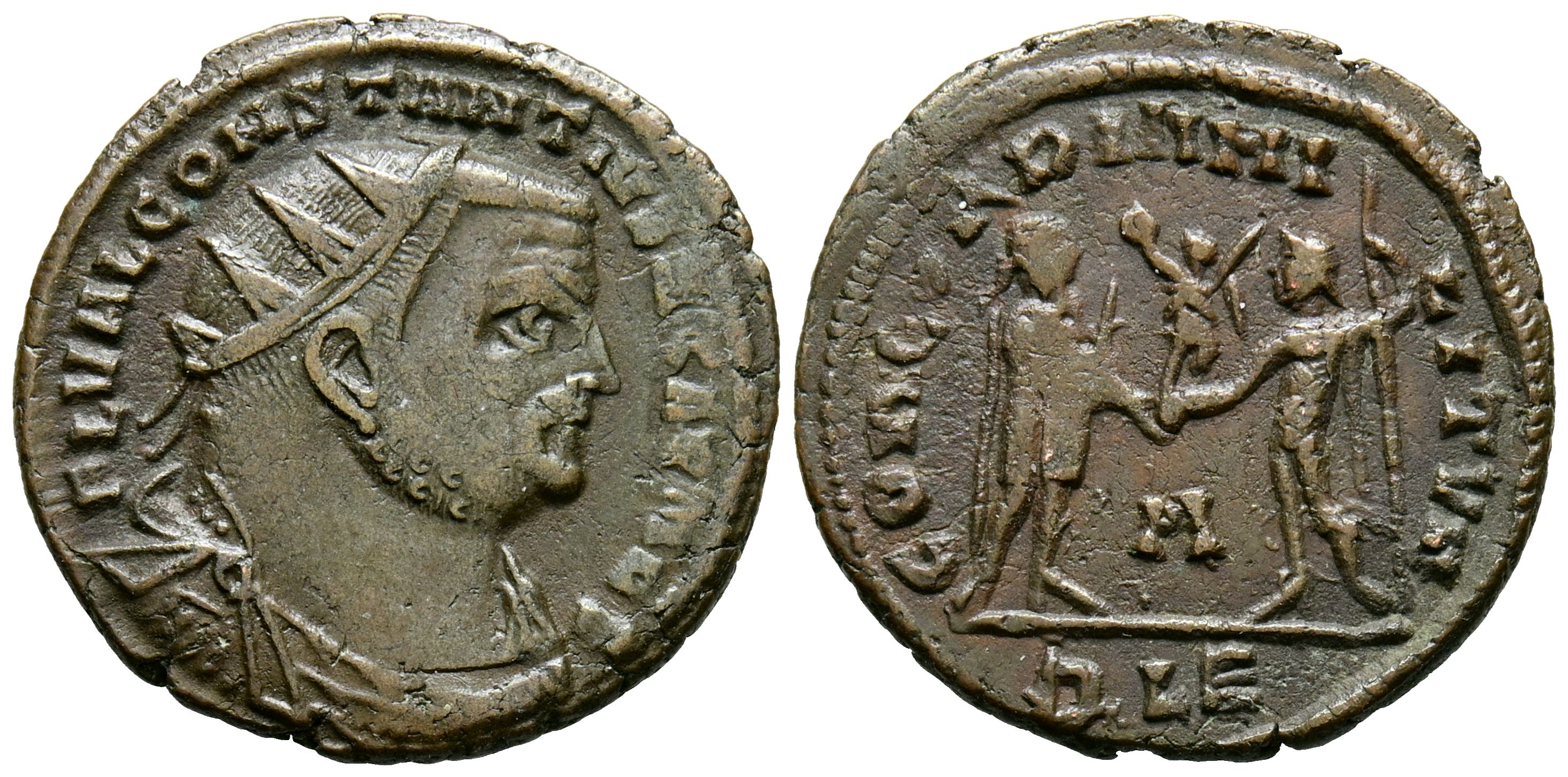 CONSTANCIO I. Antoniniano. (Ae. 3,08g/20mm). 296-297 d.C. Alejandría. (RIC 48a). Anv: Busto radiado y drapeado de Constancio I a derecha, alrededor leyenda: FL VAL CONSTANTIVS NOB CAES. Rev: Constancio I estante a derecha recibiendo Victoria con corona de laurel de Júpiter estante a izquierda portando lanza, entre ellos: A, en exergo: ALE, alrededor leyenda: CONCORDIA MILITVM. MBC.