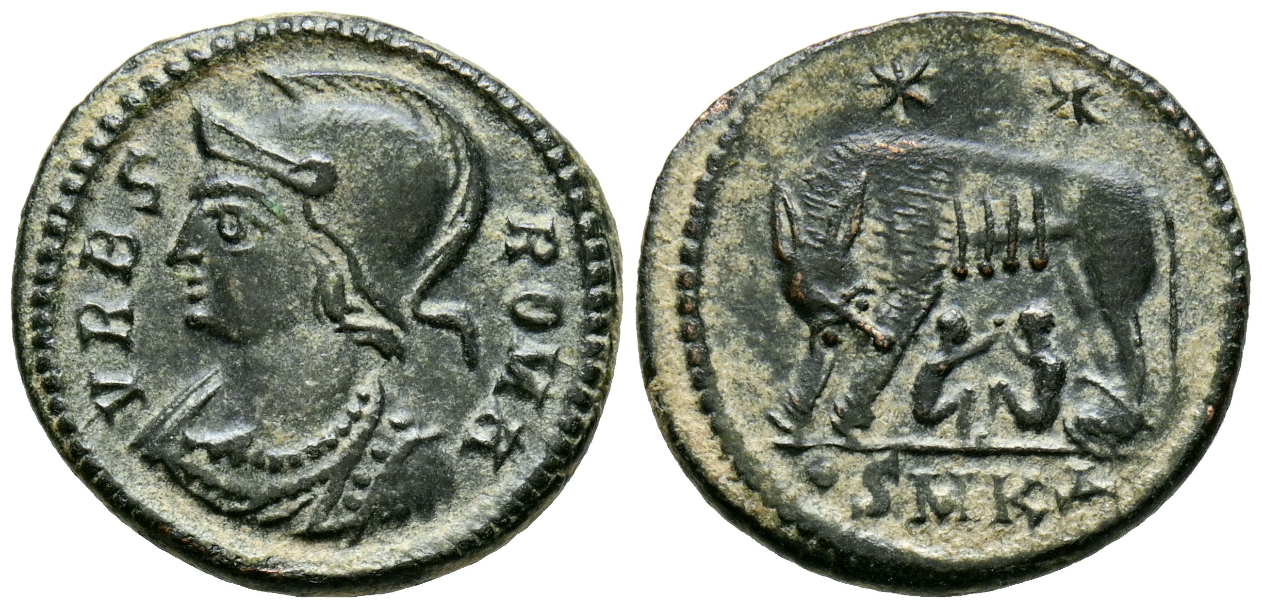 CONSTANTINO I. Follis. (Ae. 2,45g/18mm). 307-337 d.C. Cícico. (RIC 90). Anv: Busto con casco y coraza de Roma a izquierda, alrededor leyenda: VRBS ROMA. Rev: Loba alimentando a Rómulo y Remo, encima dos estrellas, en exergo: SMKA. EBC-/MBC+.