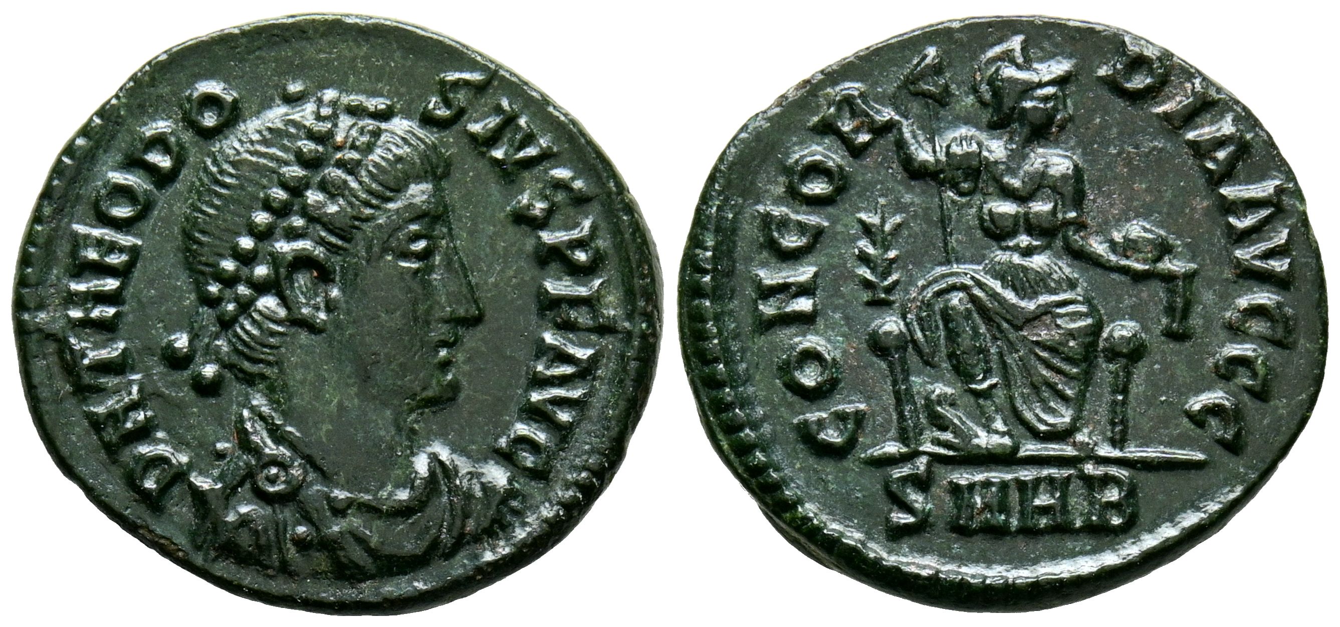 TEODOSIO I. Follis. (Ae. 2,42g/18mm). 379-395 d.C. Heráclea. (RIC 16c). Anv: Busto diademado y drapeado de Teodosio I a derecha, alrededor leyenda: D N THEODOSIVS P F AVG. Rev: Concordia sentada a derecha portando cetro y globo, entre palma y I, en exergo: SMHB, alrededor leyenda: CONCORDIA AVGGG. EBC-. Bonita pátina verde.