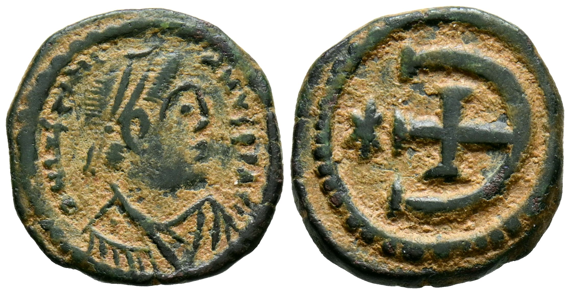 JUSTINIANO I. Pentanummium. (Ae. 2,57g/16mm). 551-560 d.C. Antioquía. (Seaby 244). Anv: Busto laureado y con coraza de Justiniano I a derecha, alrededor leyenda. Rev: Monograma, delante estrella. MBC-.