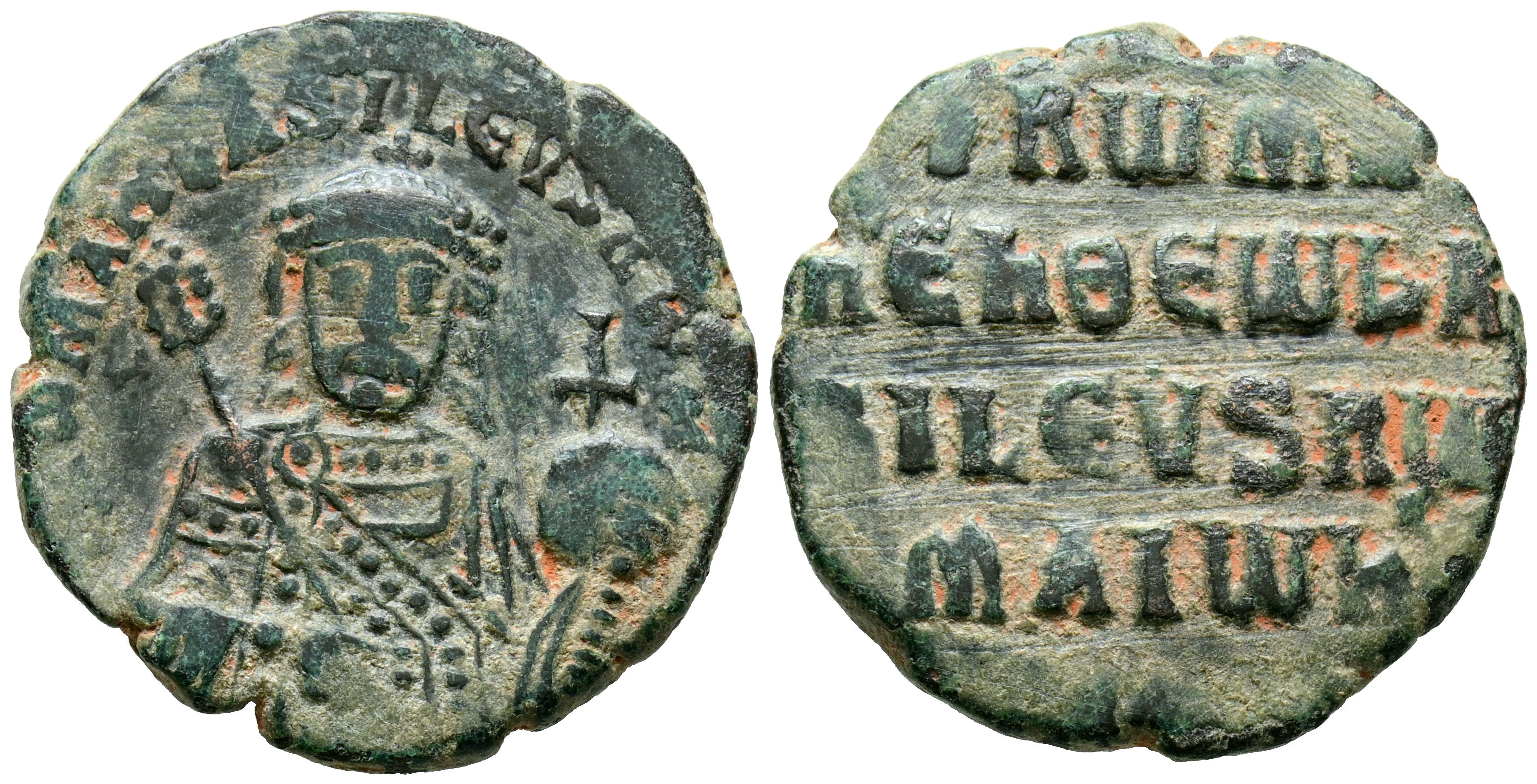 CONSTANTINO VII Porphyrogenitus y ROMANO I. Follis. (Ae. 8,06g/26mm). 913-959 d.C. Constantinopla. (Seaby 1760). Anv: Busto coronado de frente portando globo crucífero y labarum. Rev: Leyenda en cuatro líneas. MBC+.